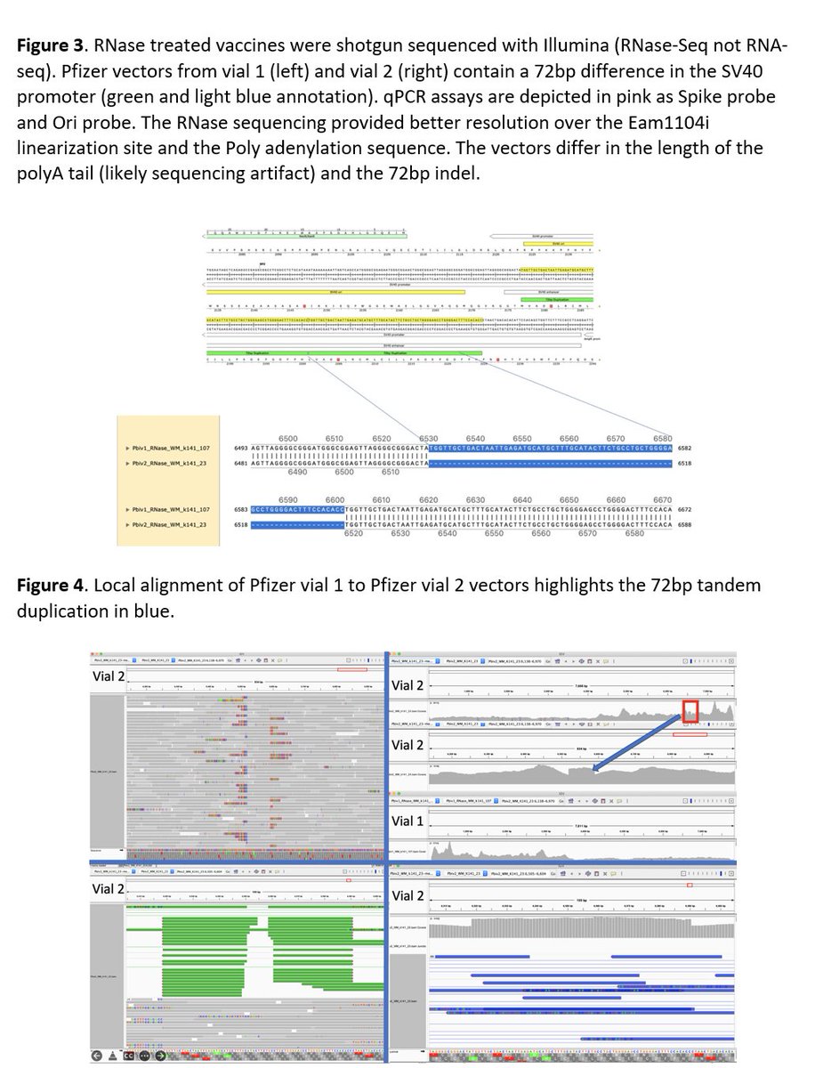Sequencing of bivalent Moderna and Pfizer mRNA vaccines reveals nanogram to microgram quantities of expression vector dsDNA per dose "The assembly of Pfizer vial 1 contains a 72bp insertion not present in the assembly of Pfizer vial 2. This indel is known for its enhancement to the SV40 promoter and its nuclear localization signal (Dean et al. 1999) (Moreau et al. 1981)." Kevin McKernan, Yvonne Helbert, Liam T. Kane, Stephen McLaughlin Medicinal Genomics @Kevin_McKernan https://osf.io/b9t7m/