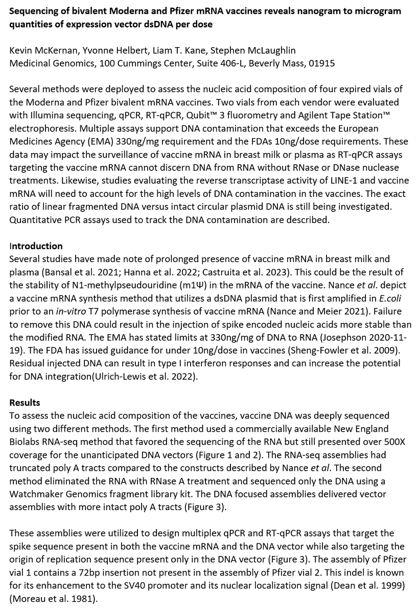 "Early in 2023, genomics scientist Kevin McKernan made an accidental discovery. While running an experiment in his Boston lab, McKernan used some vials of mRNA Pfizer and Moderna Covid vaccines as controls. He was ‘shocked’ to find that they were allegedly contaminated with tiny fragments of plasmid DNA. McKernan, who has 25 years’ experience in his field, ran the experiment again, confirming that the vials contained up to, in his opinion, 18-70 times more DNA contamination than the legal limits allowed by the European Medicines Agency (EMA) and the Food and Drug Administration (FDA). In particular, McKernan was alarmed to find the presence of an SV40 promoter in the Pfizer vaccine vials. This is a sequence that is, ‘…used to drive DNA into the nucleus, especially in gene therapies,’ McKernan explains. This is something that regulatory agencies around the world have specifically said is not possible with the mRNA vaccines.. ..Now, McKernan, Dr Buckhaults and other scientists are calling for urgent research to test whether the DNA contamination is lingering in the cells of mRNA vaccinated people, and whether the human genome has in fact been altered by mRNA Covid vaccines."