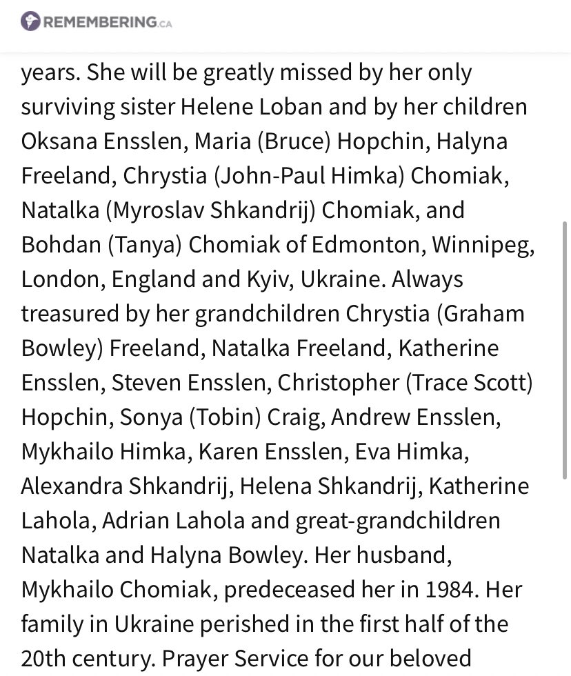 So, if I’m getting this correct - Chrystia’s mother was Halyna Chomiak. Her mother’s sister (Freeland’s aunt) was Natalka Chomiak, who married Myroslav Shkandrij, making him her uncle. So Chrystia’s uncle’s father evidently served in the Waffen-SS that received a standing ovation?