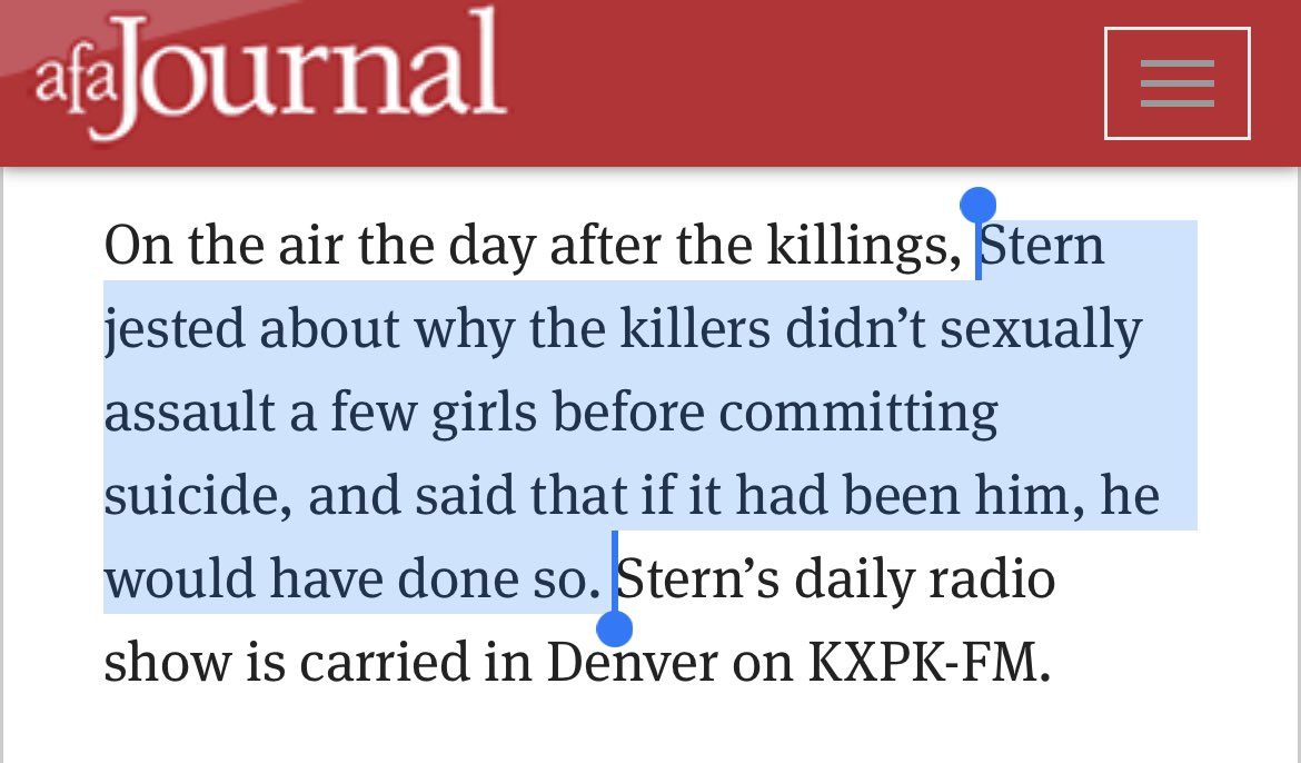 In 1999, Stern joked about the Columbine shoot*ng, wondering why “good looking” girls weren’t s*xually assaulted by the k*llers before committing suic*de. Stern says if that had been him, he would’ve done so. https://t.co/m0UiI0tggK