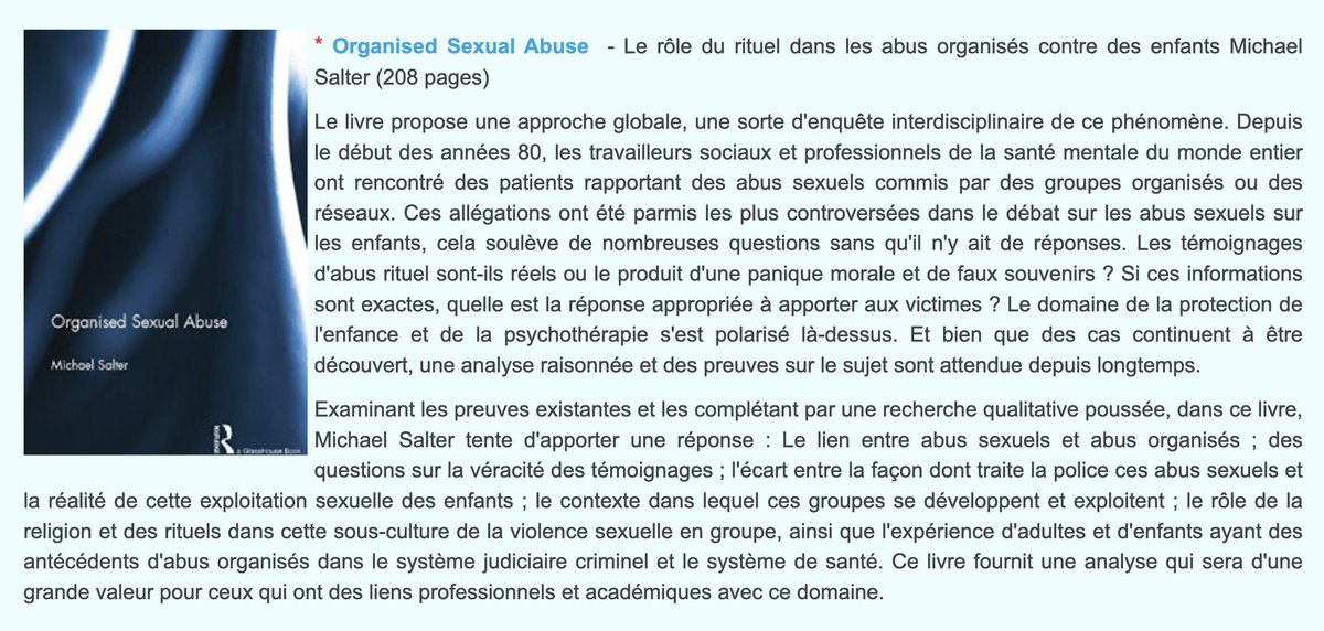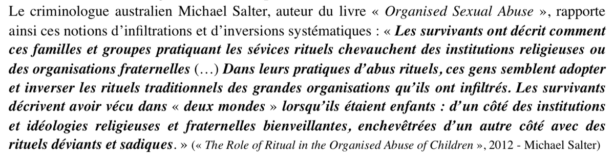 Contrairement à «l'expert» Alain Bauer, criminologue de plateaux TV, qui ne pipe jamais un mot sur le sujet; voici quelques extraits des travaux du criminologue australien Michael Salter concernant les sévices rituels en bandes organisées (les réseaux qui n'existeraient pas).⤵️⬇️