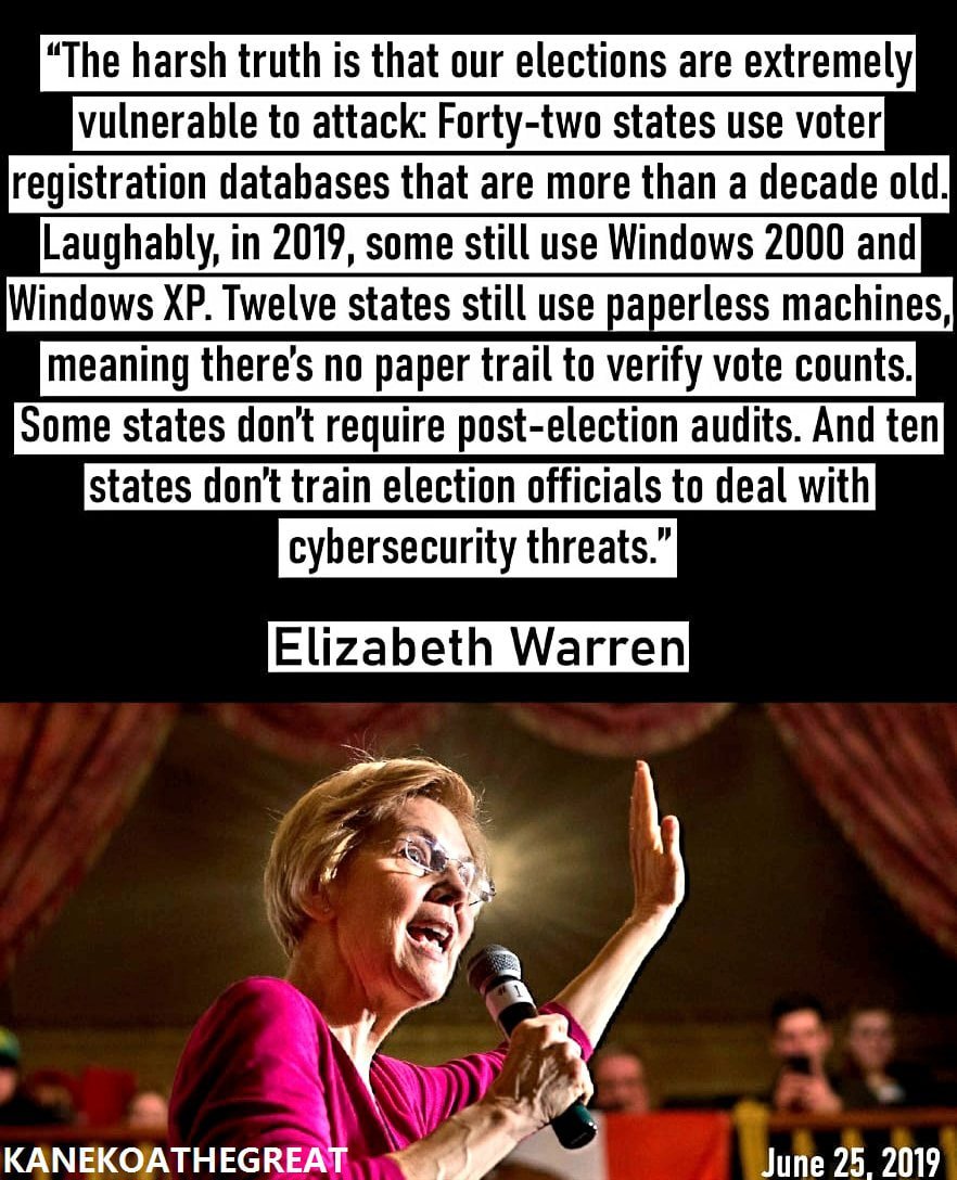 #11 Senator Elizabeth Warren published an article on her website on the vulnerabilities of the United States' election system titled "Strengthening Our Democracy" on June 25, 2019: "The harsh truth is that our elections are extremely vulnerable to attack: Forty-two states use voter registration databases that are more than a decade old. Laughably, in 2019, some still use Windows 2000 and Windows XP. Twelve states still use paperless machines, meaning there’s no paper trail to verify vote counts. Some states don’t require post-election audits. And ten states don’t train election officials to deal with cybersecurity threats." https://web.archive.org/web/20190917015401/https://elizabethwarren.com/plans/strengthening-democracy