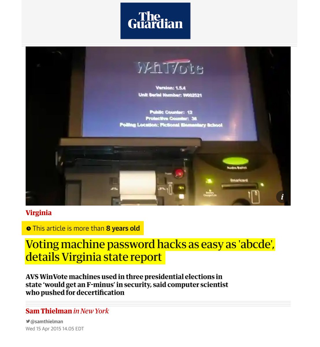 #14 The Guardian: Voting machine password hacks as easy as 'abcde' (April 15, 2015) “Touchscreen WinVote voting machines used in numerous elections between 2002 and 2014 used “abcde” and “admin” as passwords and could easily have been hacked from the parking lot outside the polling place, according to a state report… Anyone within a half mile could have modified every vote, undetected…the version of Windows operating on each of them had not been updated since at least 2004, that it was possible to “create and execute malicious code” on the WINVote and the level of sophistication to execute such an attack is low.” https://www.theguardian.com/us-news/2015/apr/15/virginia-hacking-voting-machines-security