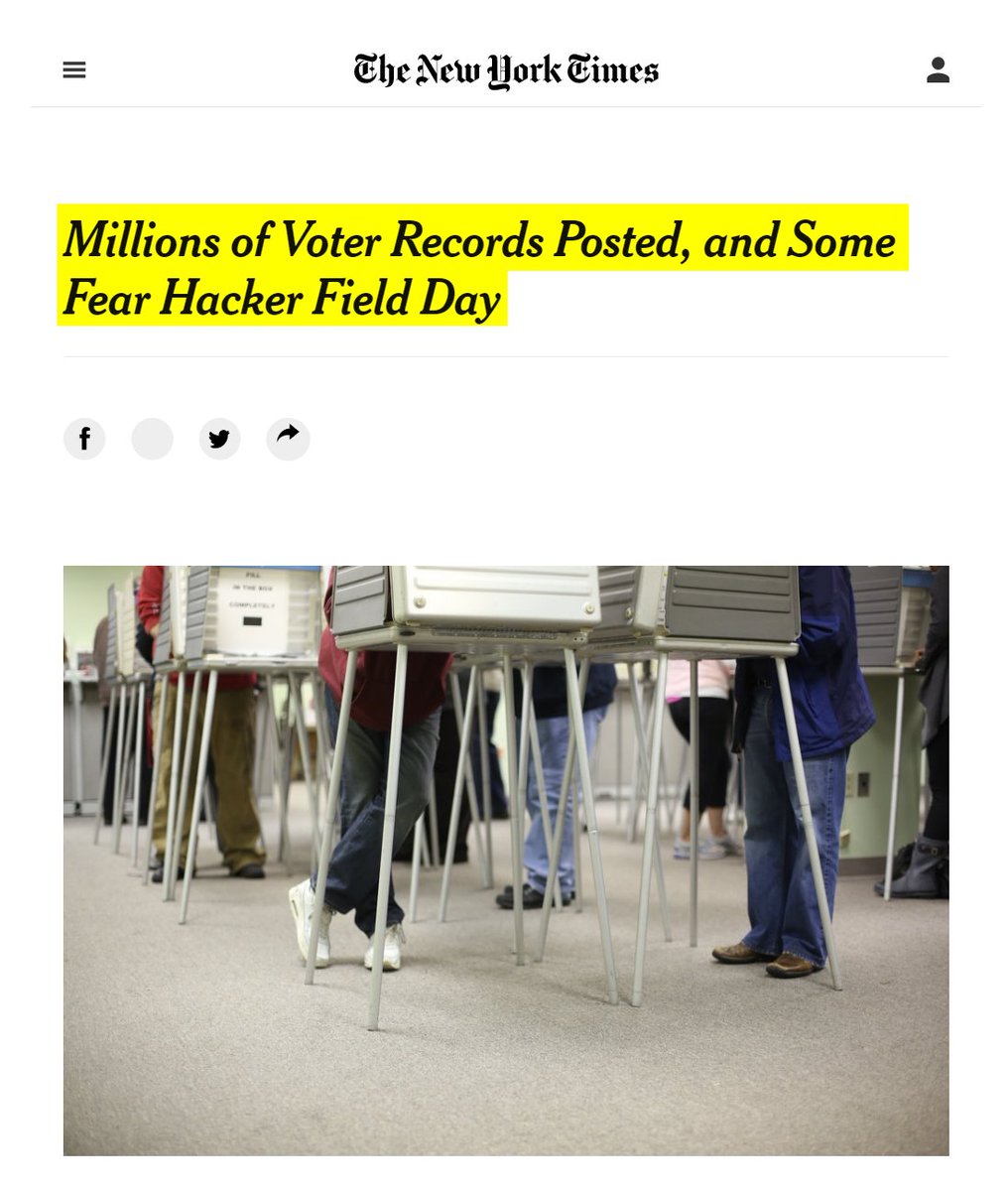 #15 New York Times: Millions of Voter Records Posted, and Some Fear Hacker Field Day (Dec. 30, 2015) “First and last names. Recent addresses and phone numbers. Party affiliation. Voting history and demographics. A database of this information from 191 million voter records was posted online over the last week, the latest example of voter data becoming freely available, alarming privacy experts who say the information can be used for phishing attacks, identity theft and extortion. It is not known who built the database, where all the data came from, and whether its disclosure resulted from an inadvertent release or from hacks…states are not taking the security of voter data seriously enough.” https://web.archive.org/web/20210212172828/https://www.nytimes.com/2015/12/31/us/politics/voting-records-released-privacy-concerns.html?_r=0