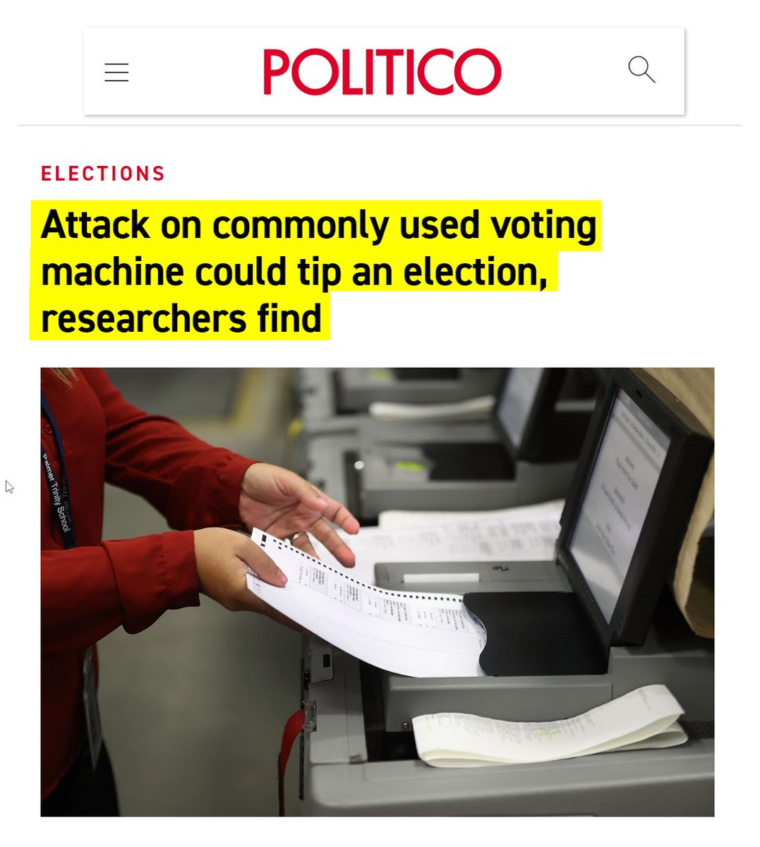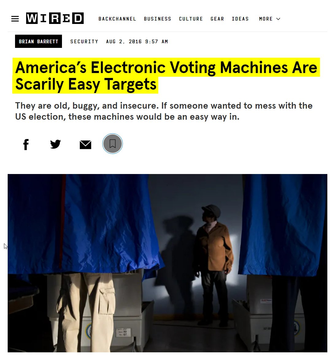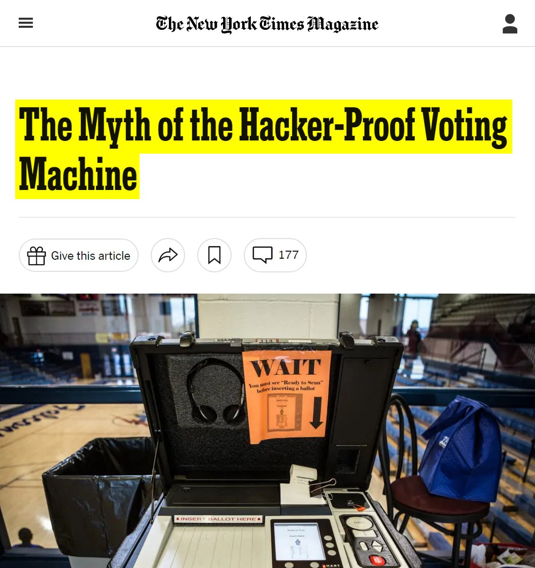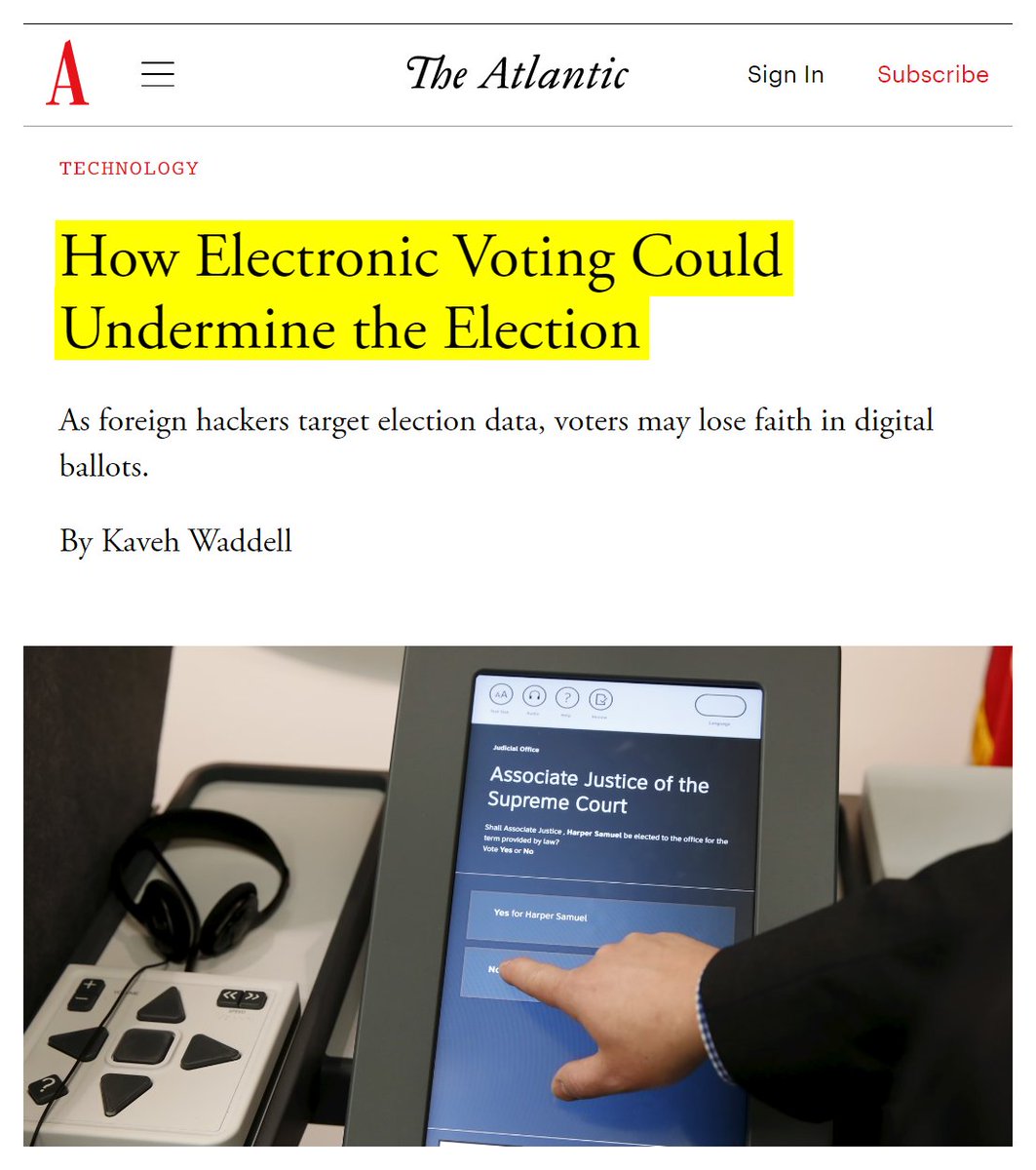 #20 The Atlantic: How Electronic Voting Could Undermine the Election (Aug. 29, 2016) “…computer-security experts think electronic voting is a very, very bad idea. For years, security researchers and academics have urged election officials to hold off on adopting electronic voting systems, worrying that they’re not nearly secure enough to reliably carry out their vital role in American democracy. Their claims have been backed up by repeated demonstrations of the systems’ fragility. When the District of Columbia tested an electronic voting system in 2010, a professor from the University of Michigan and his graduate students took it over from more than 500 miles away to show its weaknesses; with actual physical access to a voting machine, the same professor—Alex Halderman—swapped out its internals, turning it into a Pac Man console. Halderman showed that a hacker who has access to a machine before election day could modify its programming—and he did so without even leaving a mark on the machine’s tamper-evident seals…pure electronic voting is simply too dangerous: We must use paper, either directly filled out by the voter or as a voter verifiable paper audit trail…” https://www.theatlantic.com/technology/archive/2016/08/how-electronic-voting-could-undermine-the-election/497885/