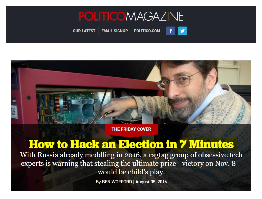 #17 Politico: How to Hack an Election in 7 Minutes (Aug. 5, 2016) “Princeton professor Andrew Appel decided to hack into a voting machine… He summoned a graduate student named Alex Halderman, who could pick the machine’s lock in seven seconds. Clutching a screwdriver, he deftly wedged out the four ROM chips—they weren’t soldered into the circuit board, as sense might dictate—making it simple to replace them with one of his own: A version of modified firmware that could throw off the machine’s results, subtly altering the tally of votes, never to betray a hint to the voter. The attack was concluded in minutes… the machines that Americans use at the polls are less secure than the iPhones they use to navigate their way there. We found the machine did not have any security mechanisms beyond what you’d find on a typical home PC, it was very easy to hack…foreign hackers could attack the state and county computers that aggregate the precinct totals on election night…They could attack digitized voter registration databases…They could infect software at the point of development, writing malicious ballot definition files that companies distribute, or do the same on a software patch… They could FedEx false software to a county clerk’s office and, with the right letterhead and convincing cover letter, get it installed. Even with optical scan voting, it’s not just the voting machines themselves—it’s the desktop and laptop computers that election officials use to prepare the ballots, prepare the electronic files from the OpScan machines, panel voter registration, electronic poll books. And the computers that aggregate the results together from all of the optical scans.” https://www.politico.com/magazine/story/2016/08/2016-elections-russia-hack-how-to-hack-an-election-in-seven-minutes-214144/