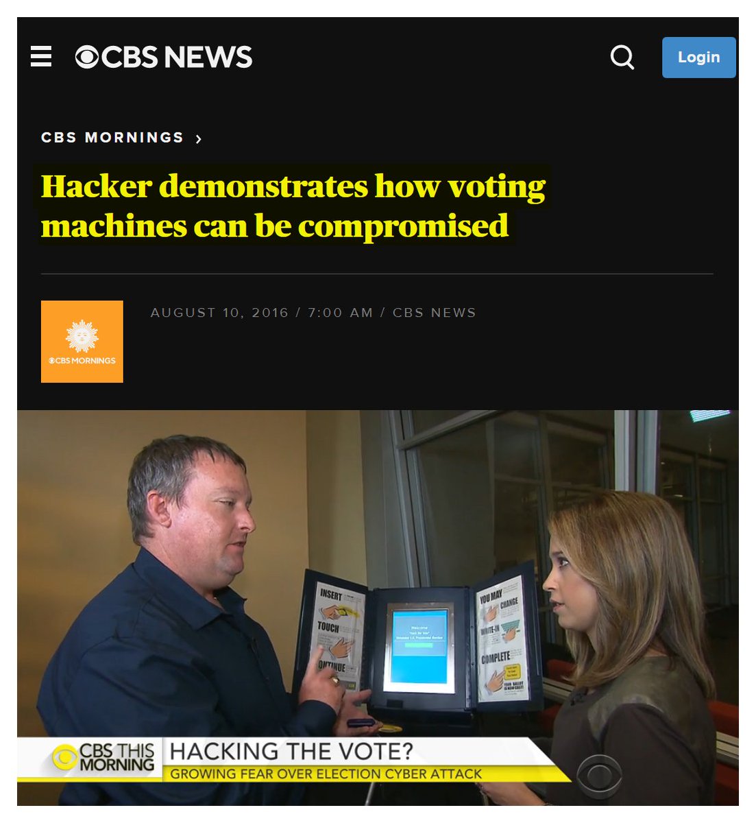 #18 CBS: Hacker demonstrates how voting machines can be compromised (Aug. 10, 2016) “Concerns are growing over the possibility of a rigged presidential election. Roughly 70 percent of states in the U.S. use some form of electronic voting. Hackers told CBS News that problems with electronic voting machines have been around for years. The machines and the software are old and antiquated. The voter doesn't even need to leave the booth to hack the machine. For $15 and in-depth knowledge of the card, you could hack the vote… There are so many places in the voting process once it goes electronic that's vulnerable. We found that more than 40 states are using voting machines there that are at least 10 years old.” https://www.cbsnews.com/news/rigged-presidential-elections-hackers-demonstrate-voting-threat-old-machines/