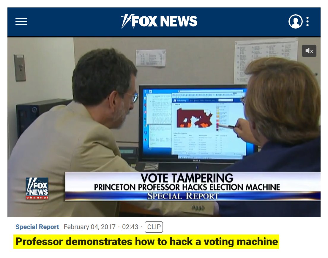 #21 FOX: Princeton Professor demonstrates how to hack a voting machine (Sept. 18, 2016) “I have demonstrated how to hack the AVC Advantage voting machines that we use in New Jersey... The touch screen voting machine, the type used in about ten states, can be tampered with... By simply swapping the machine's computer chip for his own... I figured out how to make a slightly different computer program that, just before the close of the polls, shifts some votes around from one candidate to another. I wrote that computer program onto a memory chip like this, and now to hack a voting machine, you have to get seven minutes alone with it, with a screwdriver.” https://www.foxnews.com/video/5131074167001#sp=show-clips