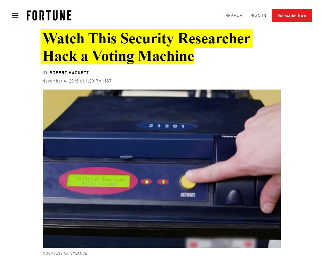 #22 Fortune: Watch This Security Researcher Hack a Voting Machine (Nov. 4, 2016) “Researchers at cybersecurity startup Cylance said they were able to hack into the Sequoia AVC Edge Mk1, used to count votes in states including California, Florida, and New Jersey, and change the final tally it produced. In Cylance's hacking demonstration, researchers were able to alter the memory of the machine as well as the paper trail it created to change vote counts and precinct records. To pull off the hack, the researchers slipped in a custom PC memory card that overwrote software embedded in the device. Cylance said it had notified Dominion Voting Systems (née Sequoia), the voting machine's maker, and government authorities about the threat.” https://fortune.com/2016/11/04/voting-machine-hack-watch-video-cylance/