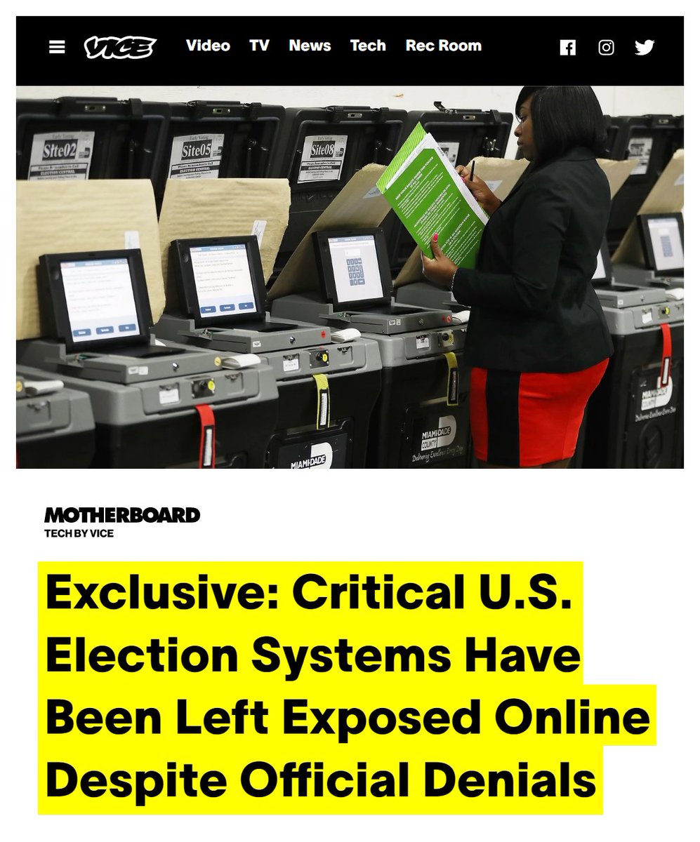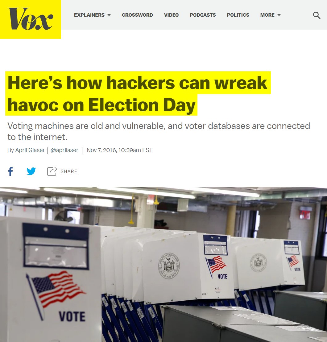 #23 Vox: Here’s how hackers can wreak havoc on Election Day (Nov. 7, 2016) “Voting machines are old and vulnerable, and voter databases are connected to the internet. Many voting machines are running software that’s over a decade old, like Windows XP, which Microsoft hasn’t issued a security patch for since 2014. Others store ballots on memory cards, which could be used to insert viruses that can cause the machines to malfunction or alter votes. Take the Sequoia AVC Edge, for example, which is used in 12 states. It was hacked by a group of academics who installed malware that made the machine unable to do anything but play Pac-Man... Across the country, state voter registration data is synced with the internet; the integration has allowed people to register online or at the DMV. But it also means those databases are vulnerable to hackers… In Indiana last month, a security researcher demonstrated how he was able to quickly break into the state’s database and edit people’s voter information. Last year, another researcher found 191 million hacked voter registration records sitting on an open database that apparently anyone could find.” https://www.vox.com/2016/11/7/13512748/hackers-election-day-voting-machines-databases-2016