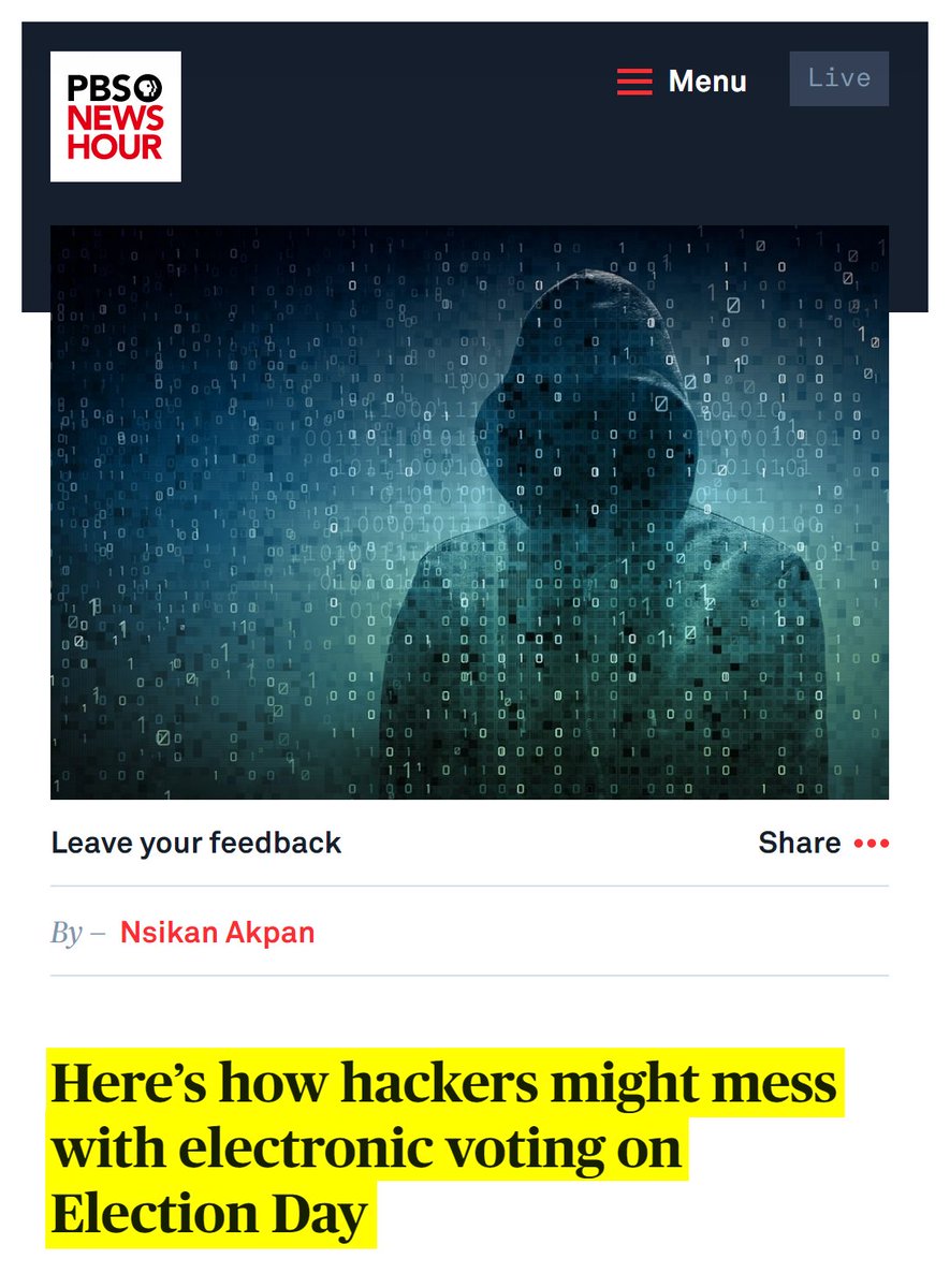 #24 PBS: Here’s how hackers might mess with electronic voting on Election Day (Nov. 8, 2016) “…vulnerabilities in electronic ballots, make hacking a major possibility on Election Day… Five states — New Jersey, Delaware, Georgia, Louisiana, and South Carolina — will cast votes on digital systems without leaving a paper trail. The same applies to several jurisdictions in battleground states like Pennsylvania and Ohio. Cyber vulnerabilities exist in all of these locations. Most revolve around the age of machines and their software. The Brennan Center report estimated 43 states will use voting machines in 2016 that are more than 10 years old. Many of these devices contain outdated software — think Microsoft Windows XP or older — without security updates. Meanwhile, the mainframes of other machines are guarded by easy-to-pick padlocks or by no barrier at all. With the kind of stealth and sophistication that’s already out there, why wouldn’t a nation-state, cyber-criminal gang, or activist group go into election systems that are completely vulnerable? …much of this voting technology is proprietary, so forensic auditors couldn’t independently scrub for and detect malicious software, especially given such code might delete itself after Election Day… Some counties use devices that collect and calculate results at once, such as the AccuVote TS and TSX voting machines. But the software for these popular machines lacks basic cybersecurity, like encryption or strong passwords. Marketplaces for voter registration data have sprouted on the Dark Web over the last year, according to an election hacking report from the ICIT. Prices vary, but one listing offered 0.5 Bitcoins ($300) for a single state’s database.” https://www.pbs.org/newshour/science/heres-how-hackers-could-mess-with-electronic-voting
