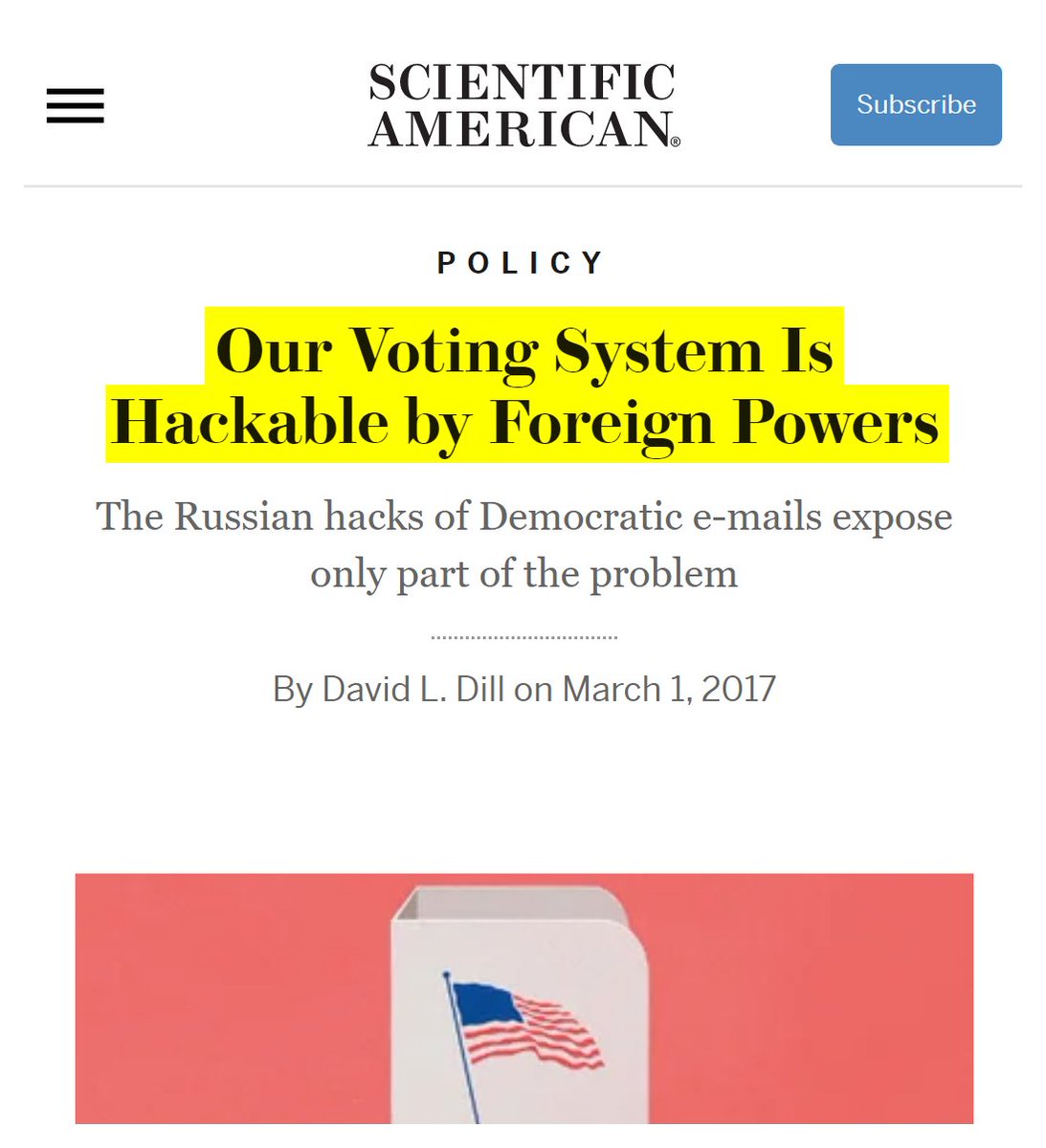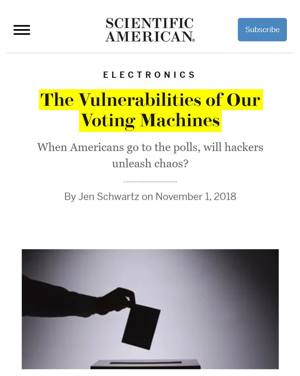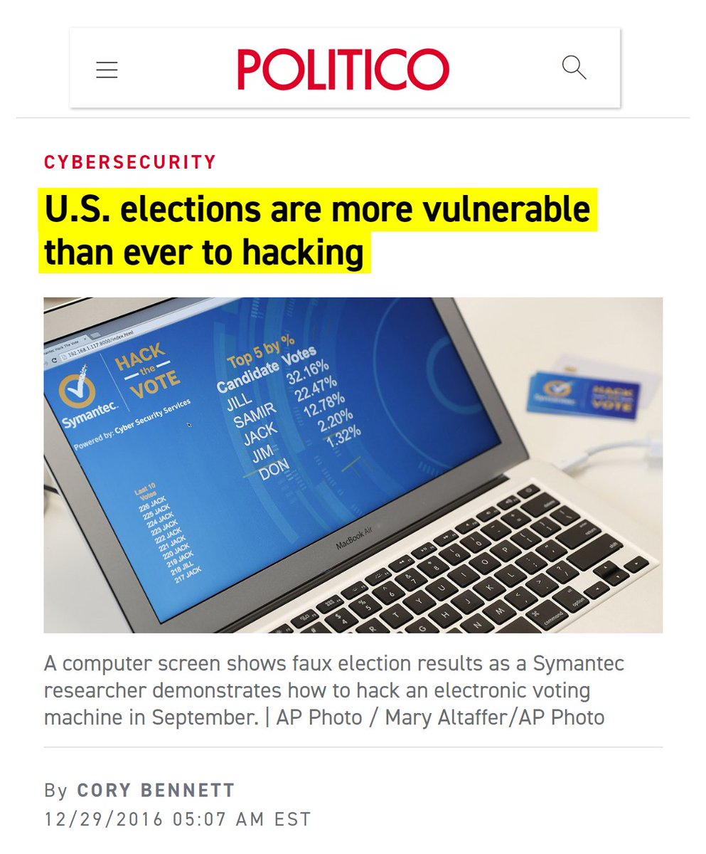 #28 ScientificAmerican: Our Voting System Is Hackable by Foreign Powers (March 1, 2017) “It is entirely possible for an adversary to hack American computerized voting systems directly and select the next commander in chief. A dedicated group of technically sophisticated individuals could steal an election by hacking voting machines in key counties in just a few states. Indeed, University of Michigan computer science professor J. Alex Halderman says that he and his students could have changed the result of the November election… It needn’t be a superpower like Russia or China. Even a medium-sized country would have the resources to accomplish this, with techniques that could include hacking directly into voting systems over the Internet, bribing employees of election offices and voting-machine vendors, or just buying the companies that make the voting machines outright. It is likely that such an attack would not be detected, given our current election security practices... We need to audit computers by manually examining randomly selected paper ballots and comparing the results with machine results. Audits require a voter-verified paper ballot, which the voter inspects to confirm that his or her selections have been correctly and indelibly recorded. Since 2003 an active community of academics, lawyers, election officials, and activists has urged states to adopt paper ballots and robust audit procedures…It is important that audits be performed on every contest in every election so that citizens do not have to request manual recounts to feel confident about election results." https://www.scientificamerican.com/article/our-voting-system-is-hackable-by-foreign-powers/#