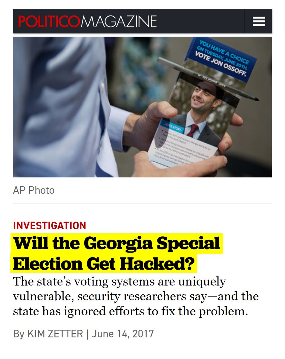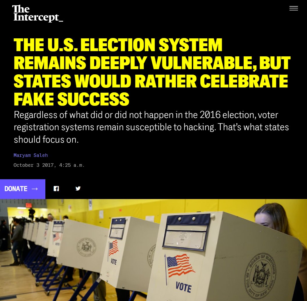 #34 The Intercept: The U.S. Election System Remains Deeply Vulnerable (Oct. 3, 2017) "The Harvard report, titled “Voter Identity Theft: Submitting Changes to Voter Registrations Online to Disrupt Elections,” concludes that online attackers can alter voter registration information in as many as 35 states and the District of Columbia by buying personal information through either legitimate or illegitimate sources. Voter registration information is public, and many states allow citizens to make changes online, even if they registered in person or by mail. A determined hacker could buy voter lists from the 36 jurisdictions that allow online registration, and separately buy the personal information used to confirm a voter’s identification – such as Social Security or driver’s license numbers – to get in and make changes. Voting software is another potential target for hackers. The Intercept has previously reported on a top-secret National Security Agency report detailing a cyberattack by a Russian intelligence agency on at least one U.S. voting software supplier. The attackers sent spear-phishing emails to more than 100 local election officials just days before the November election, according to the highly classified report that was provided anonymously to The Intercept." https://theintercept.com/2017/10/03/us-election-2016-state-voting-systems/
