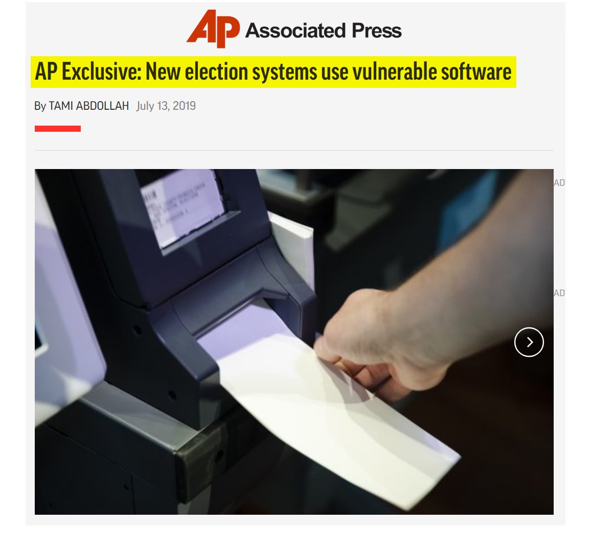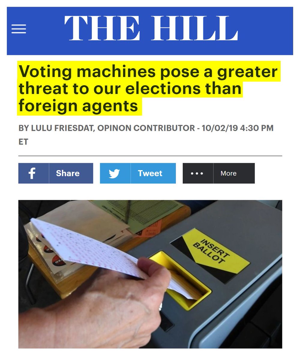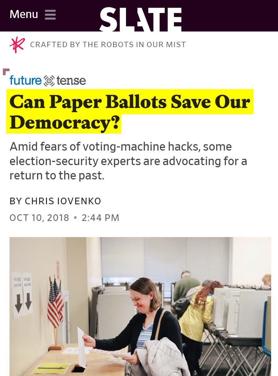 #53 Slate: Can Paper Ballots Save Our Democracy? (Oct. 10, 2018) “The machine was an AccuVote TSX used in 18 states, some with the same software version. Attackers don't need physical access--we showed how malicious code can spread from the election office when officials program the ballot design… The Center for American Progress recently released a study that highlighted that 42 states use electronic voting machines with software a decade old or more, that leaves them especially vulnerable to hacking and malware. What’s more, five states rely solely on machines that leave no paper trail, and another 10 will use them in at least some districts. These paperless voting machines are especially problematic because even if such a machine were known or suspected to have been hacked, there’s no physical backup ballot to check it against—and therefore no way to determine for certain whether the vote an individual cast matched with the vote that the machine recorded. Worse still, some of the states with the poorest voting system security are also electoral heavyweights, including Georgia, Texas, Pennsylvania, and Florida…A growing number of voting-rights advocates and cybersecurity experts—among them organizations like the National Academies of Sciences, Engineering, and Medicine and Verified Voting—feel that the way forward is in a return to the past: paper ballots.” https://slate.com/technology/2018/10/paper-ballots-voting-machines-midterm-election-security-russian-hacking.html