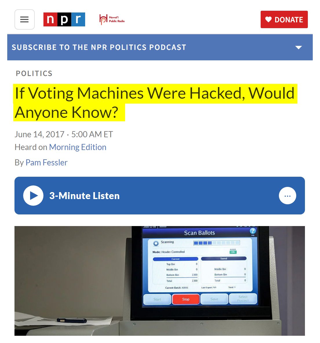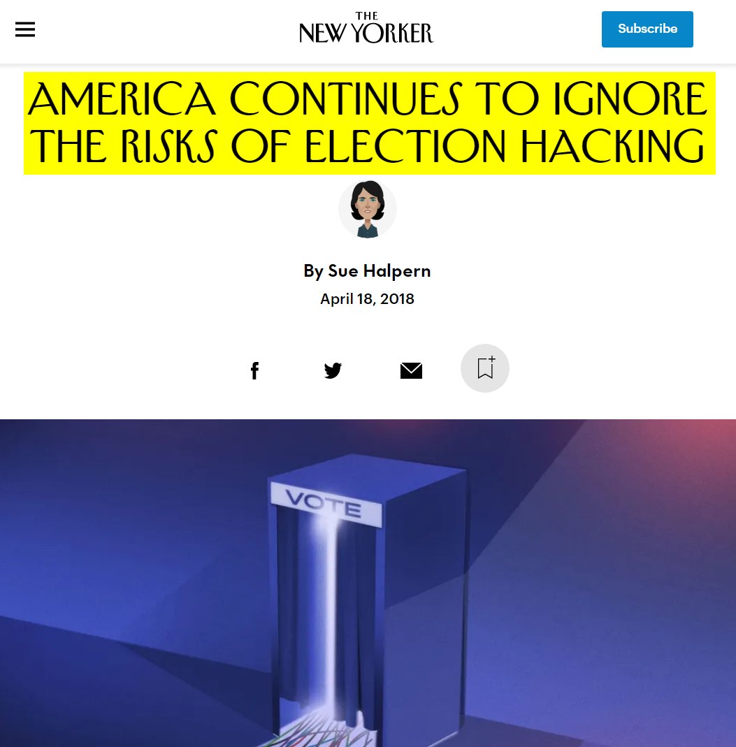 #37 New York Times: I Hacked an Election. So Can the Russians. (April 5, 2018) “After the chaos of the 2000 election, we were promised a modern and dependable way to vote, Halderman says in the video. “I’m here to tell you that the electronic voting machines Americans got to solve the problem of voting integrity - they turned out to be an awful idea. That’s because people like me can hack them all too easily. Our highly computerized election infrastructure is vulnerable to sabotage and even to cyberattacks that could change votes. Halderman has testified before Congress on the issue. He says that while it’s promising that the Senate Intelligence Committee has recently shown some understanding of the problem, states must act too. Step 1: Buy a voting machine on eBay, or if you are the North Koreans, hack the manufacturer and steal their software code. Step 2: Write a virus. Step 3: Email your virus to every election official responsible for programming the voting machines with new ballots. Many of these officials are easy to find online. Step 4: Sip coffee and wait. Step 5: Hijack the ballot programming and let the election officials copy your invisible malicious code onto the voting machines. Step 6: Watch your code silently steal votes... What chance do the people running your local elections really have against Russia or North Korea?” https://www.nytimes.com/video/opinion/100000005790489/i-hacked-an-election-so-can-the-russians.html