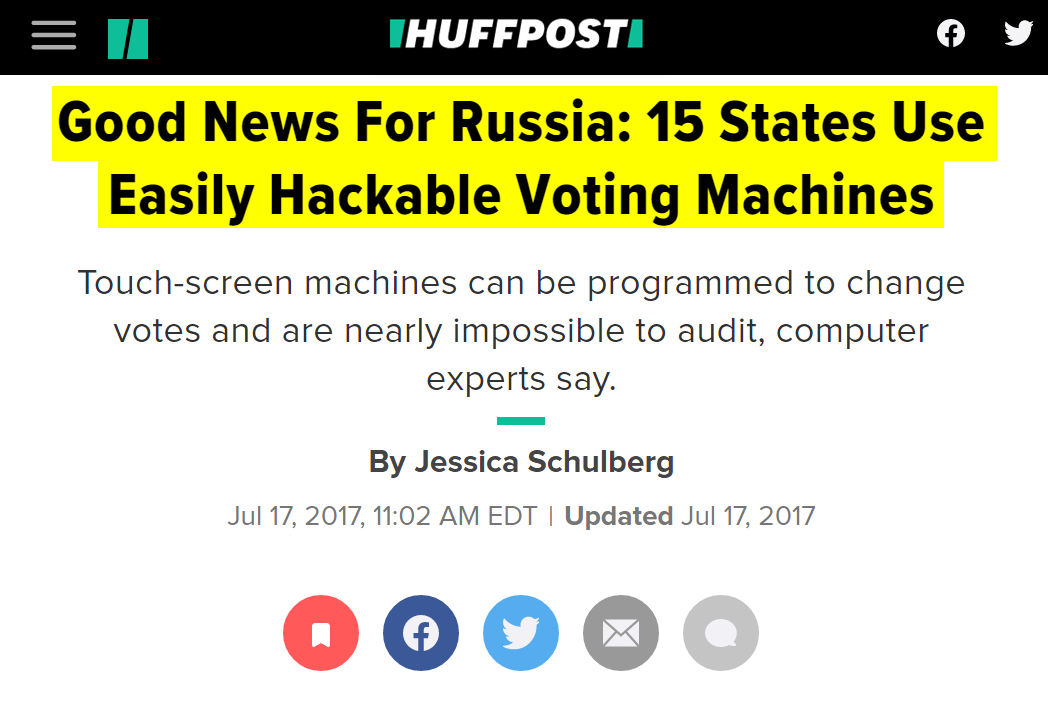 #31 HuffPost: Good News For Russia: 15 States Use Easily Hackable Voting Machines (July 17, 2017) "Touch-screen machines can be programmed to change votes and are nearly impossible to audit, computer experts say… Manufacturers like Diebold touted the touch screens, known as direct-recording electronic (DRE) machines, as secure and more convenient than their paper-based predecessors. Computer experts were skeptical since any computer can be vulnerable to viruses and malware, but it was hard to get ahold of a touch-screen voting machine to test it. The manufacturers were so secretive about how the technology worked that they often required election officials to sign non-disclosure agreements preventing them from bringing in outside experts who could assess the machines. In September 2006, they published a research paper and an accompanying video detailing how they could spread malicious code to the AccuVote TS to change the record of the votes to produce whatever outcome the code writers desired. And the code could spread from one machine to another like a virus. That was more than a decade ago, but Georgia still uses the AccuVote TS. The state is one of five ― the others are Delaware, Louisiana, New Jersey, and South Carolina ― that rely entirely on DREs for voting. Ten other states use a combination of paper ballots and DRE machines that leave no paper trail. Many use a newer version of the AccuVote known as the TSX ― even though computer scientists have demonstrated that machine, too, is vulnerable to hacking. Others use the Sequoia AVC Advantage, which Princeton professor Andrew Appel demonstrated could be similarly manipulated in a 2007 legal filing. Appel bought a Sequoia machine online for $82 and demonstrated that he could remove 10 screws and easily replace the Sequoia’s memory card with a modified version that would alter the outcome of an election… Computer scientists like Halderman, Appel, and Felten have been warning states about the risks of DRE machines for over a decade, urging them to replace touch-screen machines with paper ballots that can be read with an optical scanner and easily audited after an election. Paper ballots create a physical copy of the voter’s choice that can be checked against the results; with DRE machines, it’s impossible to verify whether the choice the person intended to select is, in fact, what the machine recorded.” https://www.huffpost.com/entry/electronic-voting-machines-hack-russia_n_5967e1c2e4b03389bb162c96