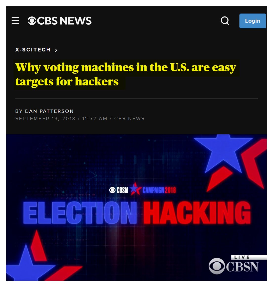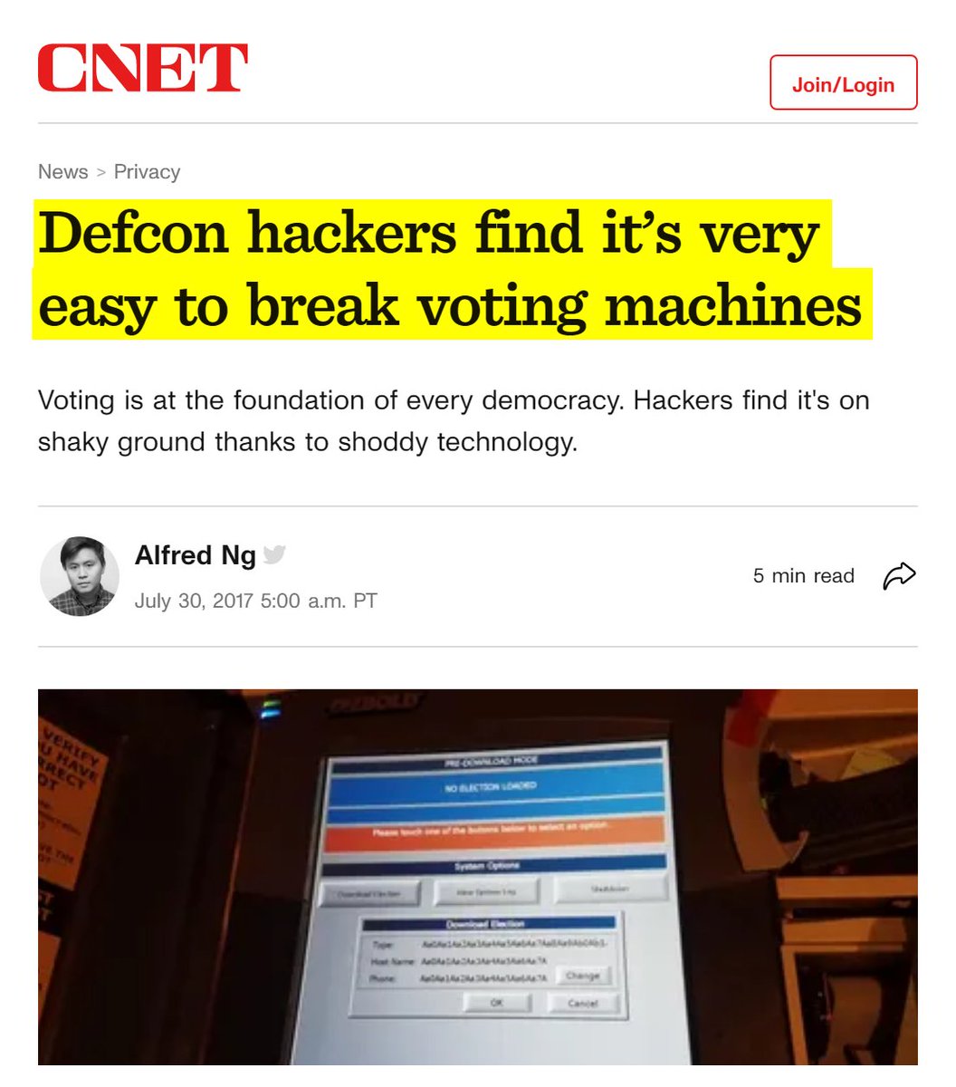 #47 CBS: Why voting machines in the U.S. are easy targets for hackers (Sept. 19, 2018) “Tens of thousands of voting machines in the United States are vulnerable to hacking. They have been successfully dismantled and attacked by security researchers for years to demonstrate their flaws. In 2017, at the annual Defcon hackers conference, one tech professor from the University of Copenhagen was able to penetrate an Advanced Voting Solutions machine in about 90 minutes. The attackers were able to access the administrator mode, allowing them to potentially alter voting data. At this year's conference, a group of hackers was able to crack one in 15 minutes. One hacker told CNET: "Should you be trusting your vote with these? I don't think so." "They're running Windows. They have USB ports. They're actual computers and are very susceptible to attacks," says Cris Thomas, the global strategy lead for IBM's X-Force cybersecurity team.” Optical scan ballot machines are vulnerable to hacking — all electronic devices are — but most cybersecurity experts are more concerned with electronic machines. Voting results are stored on the machine's internal storage. If the voting data is not encrypted or improperly configured, with little effort, a bad actor could access the memory and alter the voting results… The results go from [the voting machine] into a piece of electronics that takes it to the central counting place. That data is not encrypted, and that's vulnerable for manipulation.” https://www.cbsnews.com/news/why-voting-machines-in-the-u-s-are-easy-targets-for-hackers/