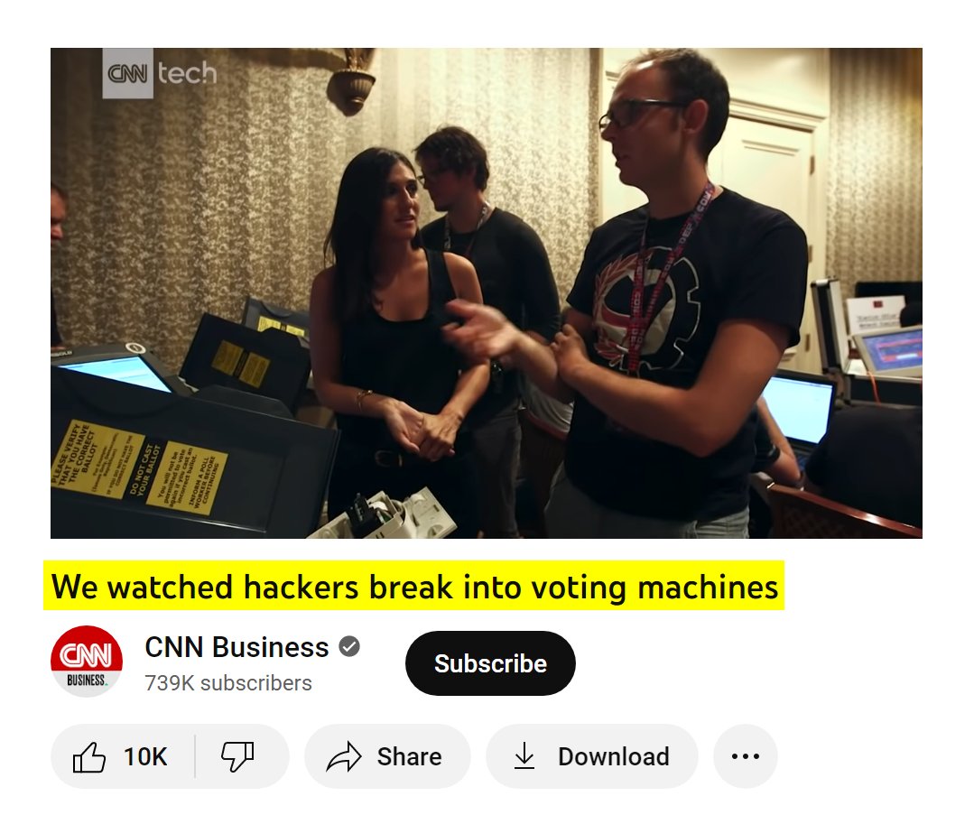 CNN Shows Inside A Hacker Conference Where American Voting Machines Are Examined Electronic Voting Machines “used in 18 different states, 8 of which are swing states” are able to be broken into within minutes without tools “Now you have full admin access on this machine” “It's having trouble rebooting because there's no card reader. And now you have full admin access on this machine. So you can disrupt the election, you can disrupt people's confidence when you think about admin access, you can think about, like, keys to the castle. When you have admin access, you own the machine. You can get it to do what you want it to do. So you can imagine that being very nefarious. US elections are so complex that we humans cannot do a manual count. We are dishonest and we are error prone. So we have to use machines while we know that the machines are hackable. So now the question is we used the machine and now we verify the results by doing a risk limiting audit, and this is where you know that the machine didn't cheat. But you cannot trust machine (the same) as a white paper ballot.”
