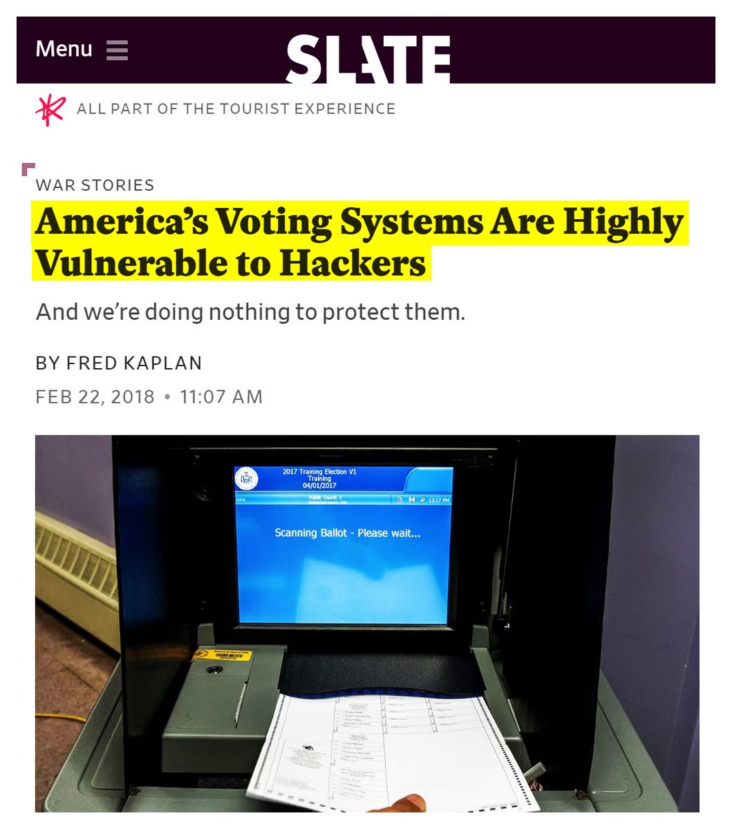 #36 Slate: America's Voting Systems Are Highly Vulnerable to Hackers (Feb. 22, 2018) “Did Russia shift the election’s outcome by hacking registration rolls or voting machines? The fact is that it’s impossible to say. In September, the Department of Homeland Security informed officials in 21 states that Russians had hacked into their registration systems in the run-up to the election. Whether the hackers manipulated the rolls—removed names, or switched their precincts—no one has investigated; perhaps no one could investigate, as so many months had passed before the hack was revealed… J. Alex Halderman a professor of computer science at the University of Michigan, testified that only a handful of vendors and contractors provide the equipment used in election machines. “Attackers could target one or a few of these companies and spread malicious code to election equipment that serves millions of voters,” he said. “Furthermore, in close elections, decentralization can actually work against us. An attacker can probe different areas of the most important ‘swing states’ for vulnerabilities, find the areas that have the weakest protection, and strike there.” For the past decade, Halderman has run the “red teams”—the simulated attacker—in games to test the vulnerability of election machines. In those games, he testified, his team “could reprogram the machine to invisibly cause any candidate to win. We also created malicious software—vote-stealing code—that could spread from machine to machine like a computer virus, and silently change the election outcome…This month, the Center for American Progress released a study measuring the degree to which each of the 50 states meets these basic standards. The results were alarming. Paperless voting systems—touch screens with no paper backups—are still used in 14 states. Only 26 states require post-election audits. Forty-one states use database software that was created more than a decade ago—so long ago that the vendors no longer track vulnerabilities or send patches to the users. More distressing still, some of the worst laggards, by these measures, are battleground states. Florida gets an F, judged as “incomplete” or “unsatisfactory” on six of seven security metrics. Pennsylvania and Arizona get D’s. Iowa, Michigan, Nevada, Virginia, and Wisconsin get C’s. No state gets an A. Just 10 get B’s.” https://slate.com/news-and-politics/2018/02/americas-voting-systems-are-still-dangerously-vulnerable-to-hacking.html