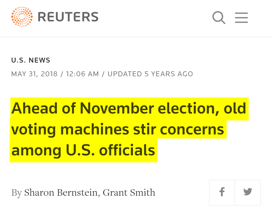 #39 Reuters: Old voting machines stir concerns among U.S. officials (May 31, 2018) “In 14 of the 40 most competitive races, Americans will cast ballots on voting machines that do not provide a paper trail to audit voters’ intentions if a close election is questioned… These include races in Pennsylvania, New Jersey, Texas, Florida, Kansas, and Kentucky. Nationwide, of 435 congressional seats up for grabs, 144 are in districts where some or all voters will not have access to machines using paper records, the analysis shows… Most of the dozen-plus state and local election officials interviewed by Reuters said they worry about bad actors hacking the older electronic voting machines to alter ballots, and then being unable to verify the results because there will be no paper trail. But the officials worry most about voters losing trust in elections because officials would not be able to visibly demonstrate that the tally was indeed accurate.” https://www.reuters.com/article/us-usa-election-votingmachines-idUSKCN1IW16Z