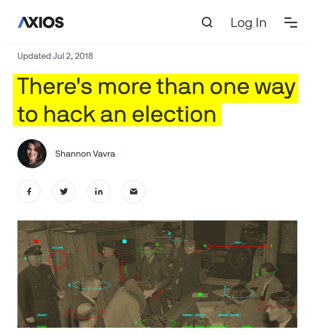 #40 Axios: There's more than one way to hack an election (July 2, 2018) “Here are the systems at risk in the election process: voter registration systems, voter registration databases (which the voter registration process produces), voter records at polling places (known as poll books, which exist in both printed and electronic versions), voting machines (which capture the votes), vote tabulation (when the votes are tallied)… Many parts of election systems are at risk of being exposed to the internet — and thereby potentially being inappropriately accessed or meddled with — because of human error or bad security protocols. Here are some of the main points of risk: registration interfaces, voter registration databases, electronic poll books, printed poll books, voting machines, electronic vote tabulation, optical scan vote tabulation, and election management systems.” https://www.axios.com/2018/07/02/be-smart-there-is-more-than-one-way-to-hack-an-election-1529424861