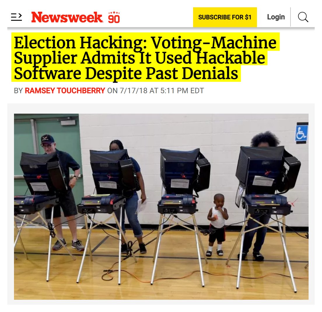 #41 Newsweek: Election Hacking: Voting-Machine Supplier Admits It Used Hackable Software Despite Past Denials (July 17, 2018) “One of the country's largest voting machine makers has admitted in a letter to a U.S. senator that some of its past election-management systems had remote-access software preinstalled, despite past denials that any of its systems were equipped with such software. Election Systems and Software (ES&S) told Democratic Senator Ron Wyden of Oregon in an April letter that has now been released, first reported by Vice News and later obtained by Newsweek, that the company provided election equipment with remote connection software to an unspecified number of states from 2000 to 2006. "Prior to the inception of the [Election Assistance Commission] testing and certification program and the subsequent requirement for hardening and at customer's request, ES&S provided pcAnywhere remote connection software on the [Election-Management System] workstation to a small number of customers between 2000 and 2006," wrote Tom Burt, ES&S president.” Wyden told Vice the decision to sell any voting system with remote-access software, leaving equipment possibly vulnerable to hacking, was "the worst decision for security short of leaving ballot boxes on a Moscow street corner." https://www.newsweek.com/election-hacking-voting-machines-software-1028948