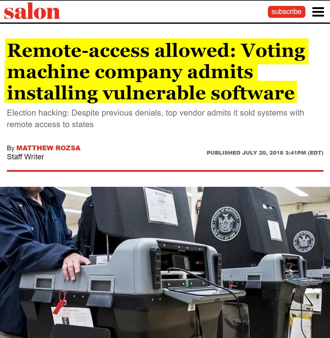 #42 Salon: Remote-access allowed: Voting machine company admits installing vulnerable software (July 20, 2018) “A letter sent to Congress reveals that, between 2000 and 2006, one of America's top voting machine companies installed remote-access software in their products that made it possible for them to be manipulated by third parties. In the letter, Election Systems and Software admitted that it had "provided pcAnywhere remote connection software … to a small number of customers between 2000 and 2006." As The Verge notes, "pcAnywhere’s security vulnerabilities have been well-documented in the past": In 2006, hackers stole the source code for pcAnywhere and then stayed quiet until 2012, when a hacker published part of the code online. Symantec, which distributed pcAnywhere, knew vaguely of the theft back in 2006 but only spoke up about it after the code leaked, along with the warning that users should disable or uninstall the software. At the same time, security researchers studied pcAnywhere’s code and found a vulnerability that could let a hacker take control of a whole system and bypass the need to enter a password.” https://www.salon.com/2018/07/20/remote-access-allowed-voting-machine-company-admits-installing-vulnerable-software/