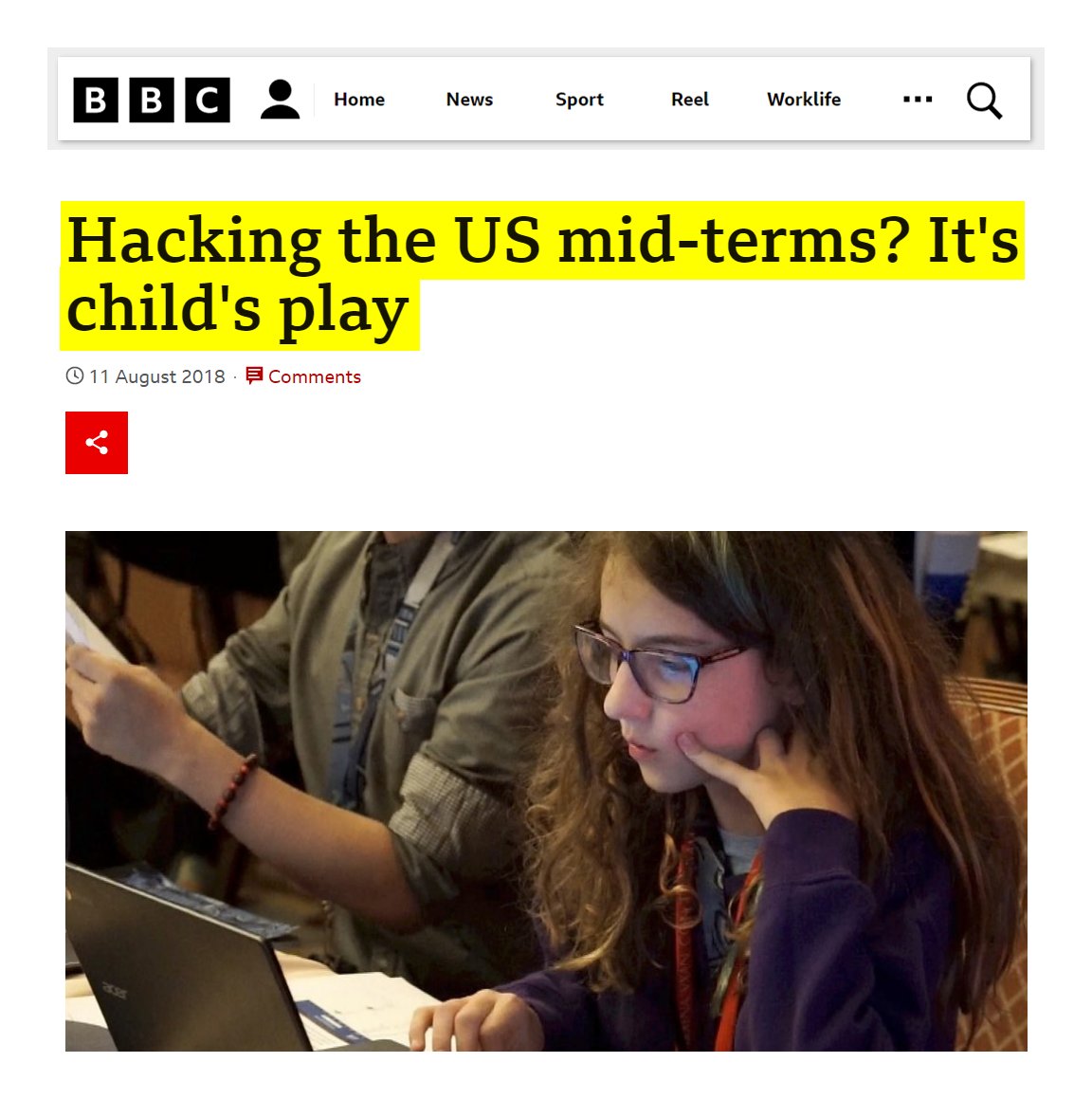 #43 BBC: Hacking the US mid-terms? It's child's play (Aug. 11, 2018) “Bianca Lewis, 11, has many hobbies. She likes Barbie, video games, fencing, singing… and hacking the infrastructure behind the world’s most powerful democracy…She’s taking part in a competition organized by R00tz Asylum, a non-profit organization that promotes “hacking for good” …Its aim is to send out a dire warning: the voting systems that will be used across America for the mid-term vote in November are, in many cases, so insecure a young child can learn to hack them with just a few minute’s coaching.” https://www.bbc.com/news/technology-45154903