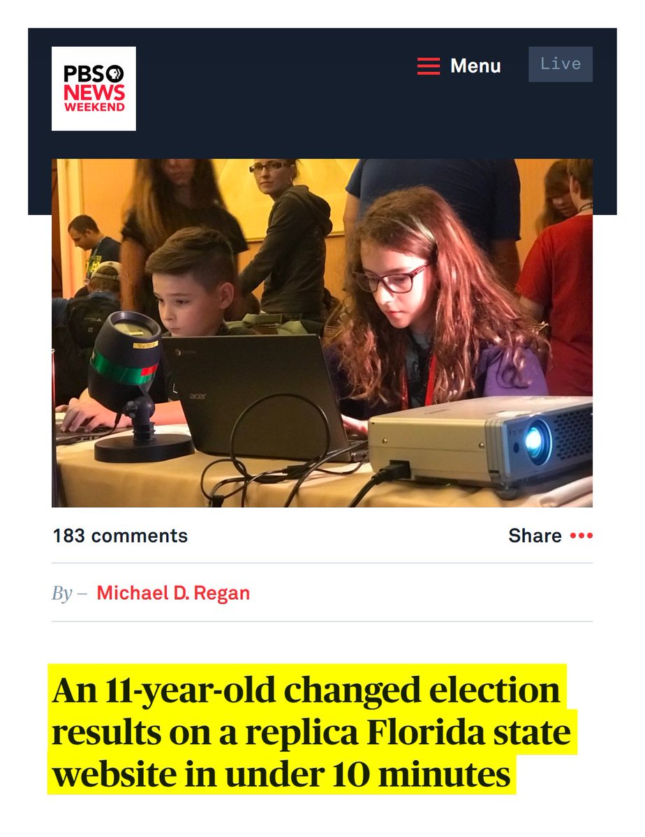 #44 PBS: An 11-year-old changed election results on a replica Florida state website in under 10 minutes (Aug. 12, 2018) “An 11-year-old boy on Friday was able to hack into a replica of the Florida state election website and change voting results found there in under 10 minutes during the world’s largest yearly hacking convention, DEFCON 26, organizers of the event said. “These are very accurate replicas of all of the sites,” Sell told the PBS NewsHour on Sunday. “These things should not be easy enough for an 8-year-old kid to hack within 30 minutes; it’s negligent for us as a society.” https://www.pbs.org/newshour/nation/an-11-year-old-changed-election-results-on-a-replica-florida-state-website-in-under-10-minutes