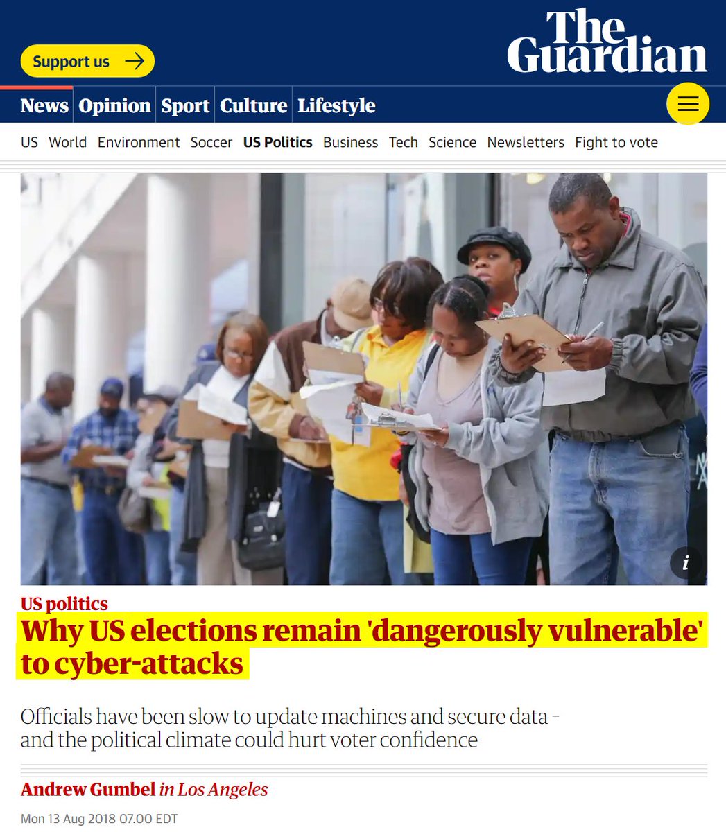 #45 The Guardian: Why US elections remain 'dangerously vulnerable' to cyber-attacks (Aug. 13, 2018) “By mid-evening, Jon Ossoff, the leading Democrat, had 50.3% of the vote, enough to win outright without the need for a run-off against his closest Republican challenger. Then Marks noticed that the number of precincts reporting in Fulton County, encompassing the heart of Atlanta, was going down instead of up. Soon after, the computers crashed. Election officials later blamed a “rare error” with a memory card that didn’t properly upload its vote tallies. When the count resumed more than an hour later, Ossoff was suddenly down to 48.6% and ended up at 48.1%… Georgia’s 15-year-old all-electronic voting system was almost impossible to audit because it produced no independently verifiable paper trail to check against the computer-generated tallies. Cybersecurity experts have warned for years that malfeasance, technical breakdown, or administrative incompetence could easily wreak havoc with electronic systems and could go largely or wholly undetected. “Virtually every American voter has come to understand that the nation’s election infrastructure is susceptible to malicious manipulation from local and foreign threats,” the suit reads. “Yet, Georgia’s election officials continue to defend the state’s electronic voting system that is demonstrably unreliable and insecure, and have repeatedly refused to take administrative, regulatory or legislative action to address the election security failures.” https://www.theguardian.com/us-news/2018/aug/13/us-election-cybersecurity-hacking-voting