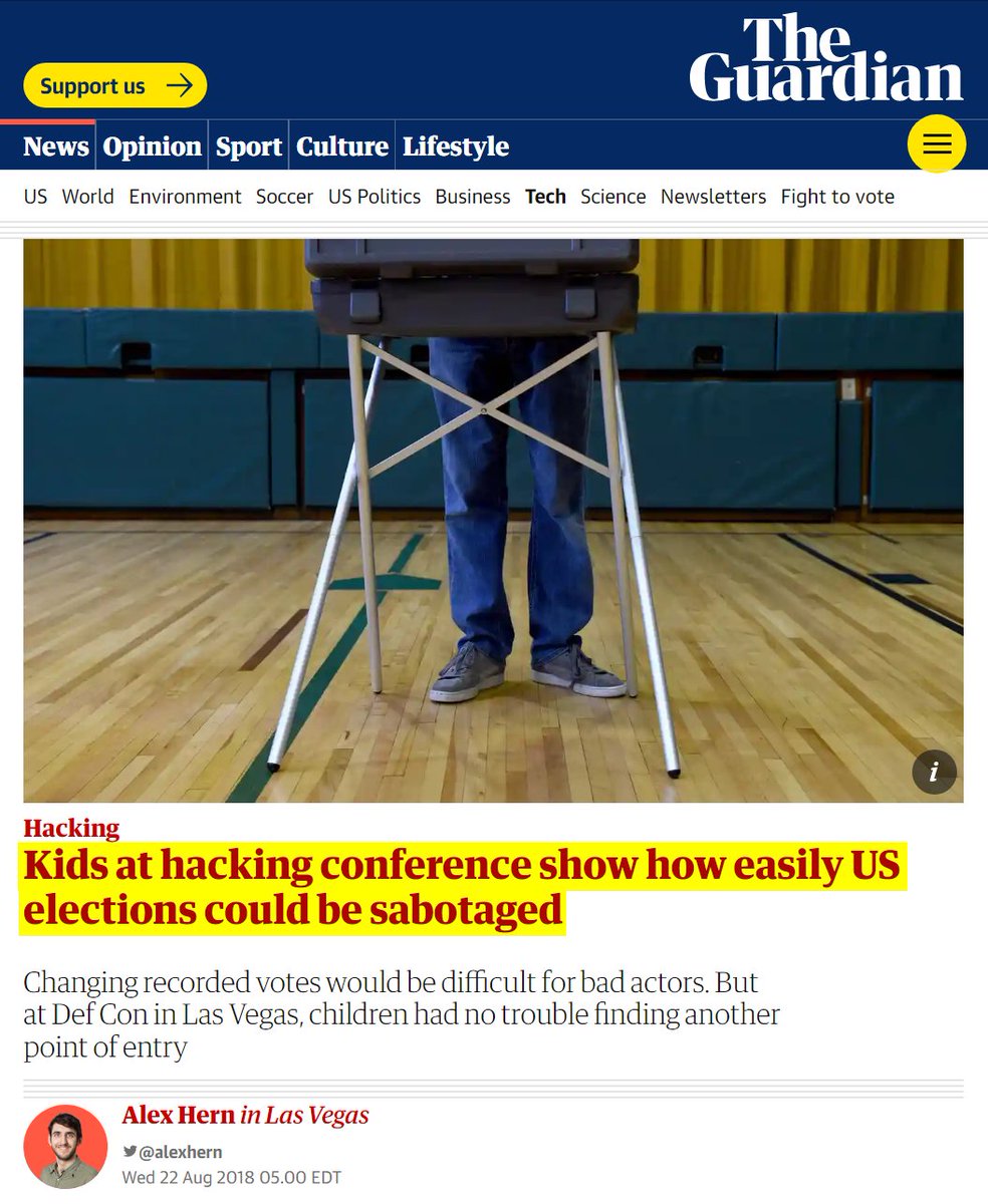 #46 The Guardian: Kids at hacking conference show how easily US elections could be sabotaged (Aug. 22, 2018) “The risk of a hacker casting the validity of an election into question through one of any number of other entry points is huge, and the actual difficulty of such an attack is child’s play. Literally. “The most vulnerable part of election infrastructure is the websites,” explained the security expert Jake Braun… Unlike a voting machine, Braun explains, websites represent a compelling target because they are, by their nature, connected to the internet 24/7. And, whether they are used for voter registration, online campaigning, or announcing the results at the end of the election, they can be used to sow havoc…Armed with facsimiles of the websites of 13 battleground states and a child-friendly guide to basic hacking techniques, the kids were set loose on critical infrastructure – and proceeded to tear it apart… “The No 1 thing we found last year wasn’t a hack at all; it was the fact that we opened up the back of the machine, and of course, no surprise, all the parts are made across the world, especially China. This isn’t conjecture; this isn’t my dystopian fantasy world; this is something we know they do …The fragmentation argument is absolute horseshit because once you’re in the chips, you can hack whole classes of machines, nationwide, from the fucking Kremlin.”… The bad actor just needs to steal enough votes in a few counties in America’s battleground states – just enough to swing a close election…“I’ve only one conclusion,” said Schürmann: “Use paper and do your audits.” https://www.theguardian.com/technology/2018/aug/22/us-elections-hacking-voting-machines-def-con