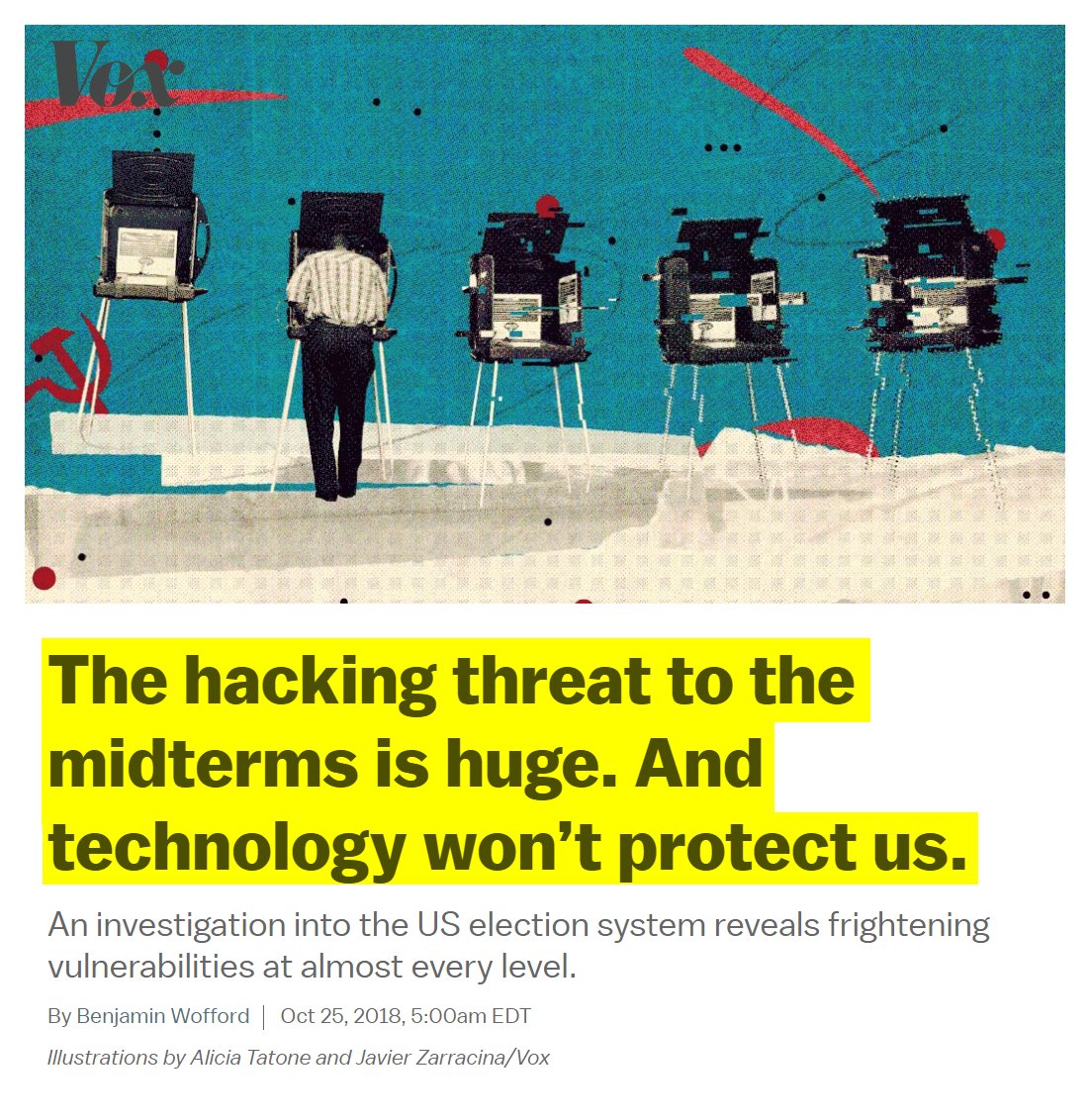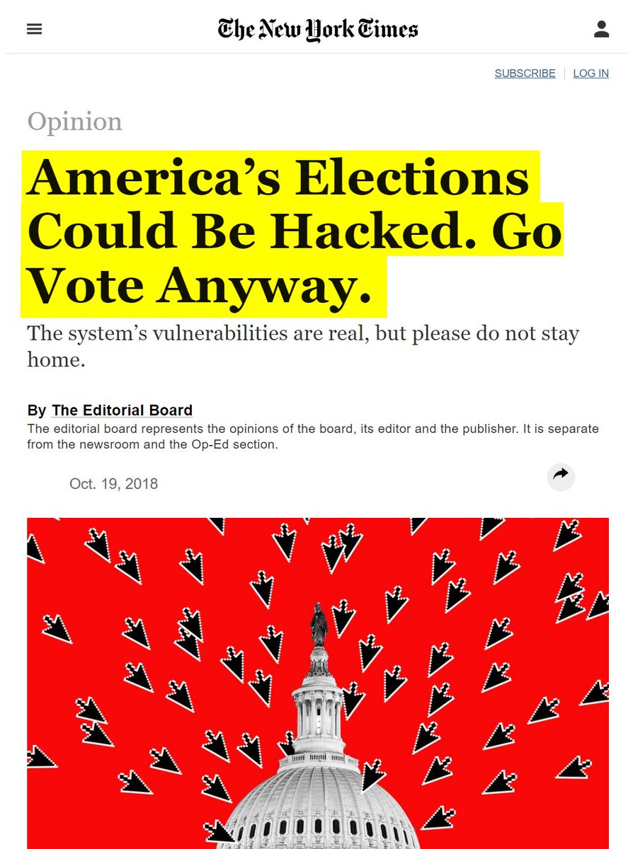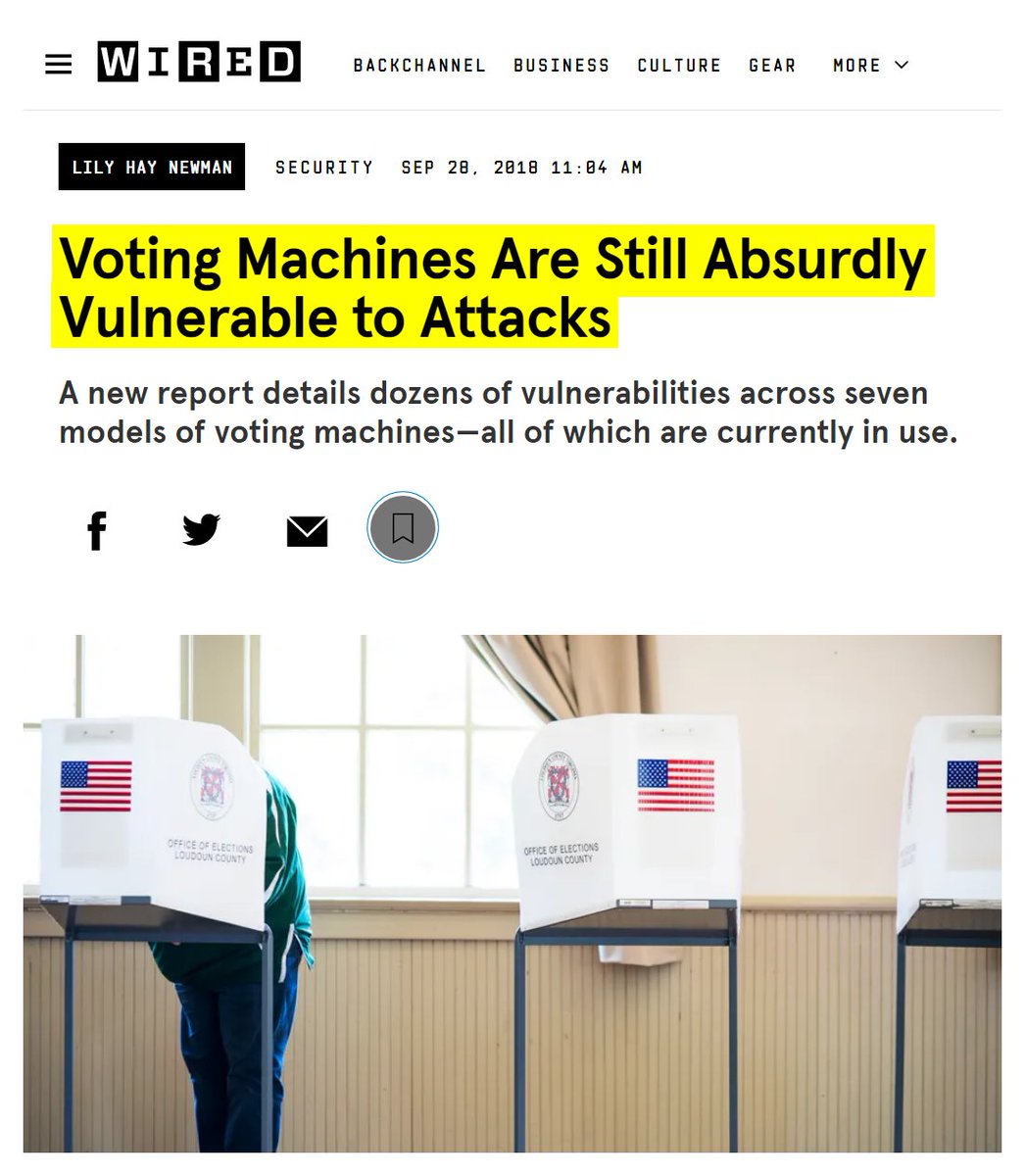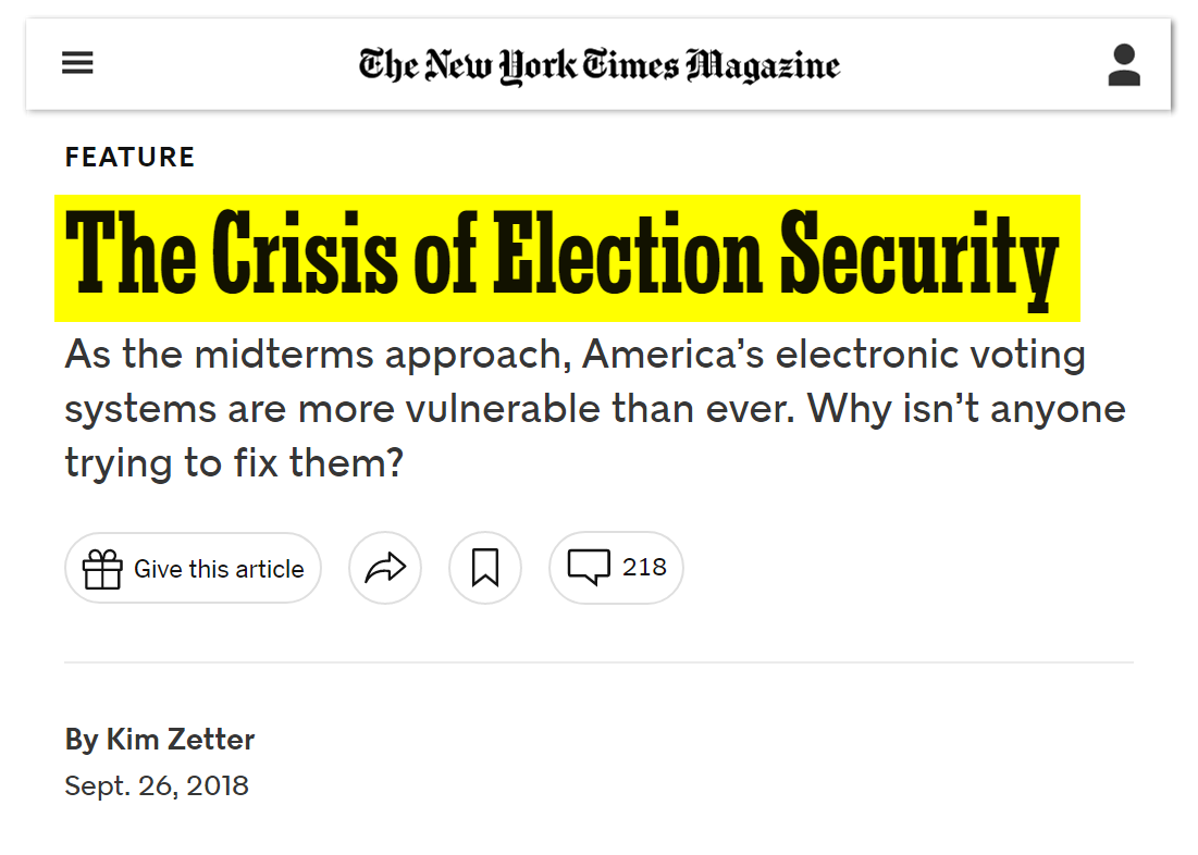 #54 New York Times: America's Elections Could Be Hacked. Go Vote Anyway. (Oct. 19, 2018) "In April, the nation’s top voting machine manufacturer told Senator Ron Wyden of Oregon that it had installed remote-access software on election-management systems that it sold from 2000 to 2006. Senator Wyden called it “the worst decision for security short of leaving ballot boxes on a Moscow street corner.” At a hacking convention last summer, an 11-year-old boy who had been coached on finding the vulnerabilities in a mock-up of Florida’s state election website broke into the fake site and altered the vote totals recorded there. It took him less than 10 minutes…America’s voting systems, like all large and complex computerized systems, are highly vulnerable to cyberattack — whether by altering or deleting voter registration data, or even by changing vote counts. “The vast majority of technical infrastructure for our voting is absolutely, without doubt, woefully insecure,” said Matt Blaze, a University of Pennsylvania computer-science professor who studies voting machine security. Both of the primary methods by which Americans cast their ballots — optical-scan machines and touch-screen monitors — can be tampered with fairly easily… One, provide a paper trail for every vote. Hackers work most effectively in the dark, so they love voting machines that produce no paper verification. Currently, five states — Delaware, Georgia, Louisiana, New Jersey, and South Carolina — run their elections entirely on paperless touch-screen machines. But all five states are considering a switch back to paper ballots in time for 2020. In this year’s midterms, 19 states and Washington, D.C., will use only paper ballots. Two, audit the vote." https://web.archive.org/web/20181118161745/https://www.nytimes.com/2018/10/19/opinion/midterm-elections-hacking.html