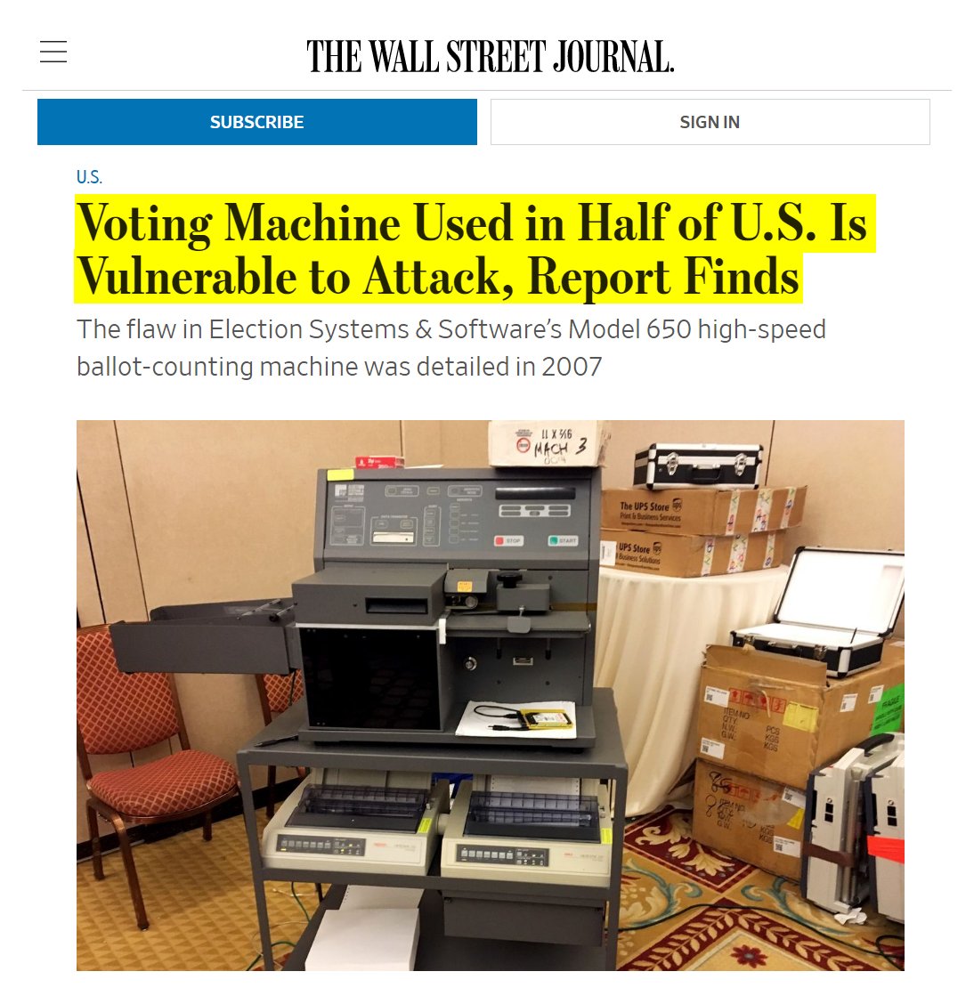 #50 WSJ: Voting Machine Used in Half of U.S. Is Vulnerable to Attack (Sept. 27, 2018) “Election machines used in more than half of U.S. states carry a flaw disclosed more than a decade ago that makes them vulnerable to a cyberattack, according to a report to be delivered Thursday on Capitol Hill. The issue was found in the widely used Model 650 high-speed ballot-counting machine made by Election Systems & Software LLC, the nation’s leading manufacturer of election equipment. It is one of about seven security problems in several models of voting equipment described in the report, which is based on research conducted last month at the Def Con hacker conference. The flaw in the ES&S; machine stood out because it was detailed in a security report commissioned by Ohio’s secretary of state in 2007, said Harri Hursti, an election-security researcher who co-wrote both the Ohio and Def Con reports. “There has been more than plenty of time to fix it,” he said…Earlier this month, the National Academies of Sciences, Engineering, and Medicine recommended U.S. states move away from voting machines that don’t include paper ballots…Election security researchers and politicians aren’t convinced ES&S; is doing enough. The company hasn’t adopted common internet security standards that secure against phishing attacks and make it harder to intercept messages, according to staffers for Sen. Ron Wyden (D., Ore.).” https://www.wsj.com/articles/widely-used-election-systems-are-vulnerable-to-attack-report-finds-1538020802