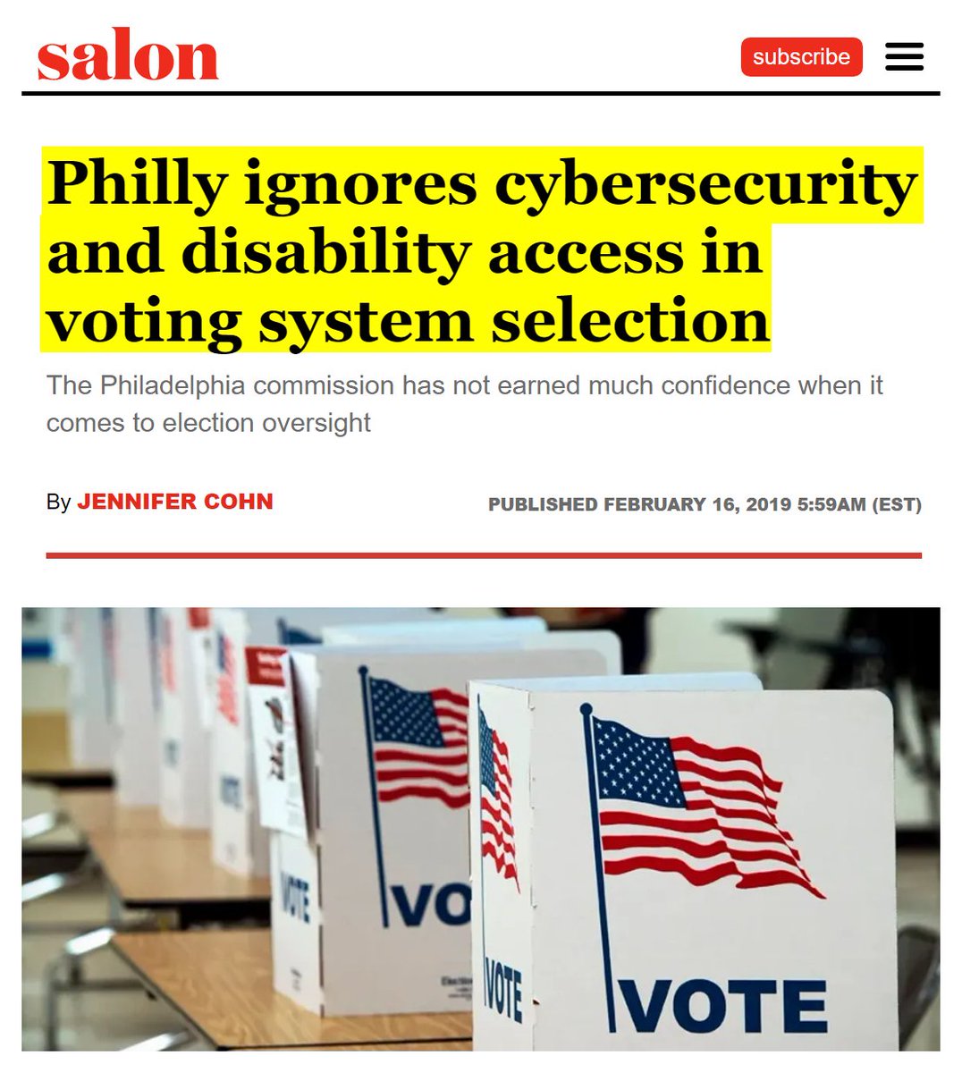 #57 Salon: Philly ignores cybersecurity and disability access in voting system selection (Feb. 16, 2019) "According to computer science professor Richard DeMillo of Georgia Tech, the barcodes also can be manipulated to instruct the scanners to flip votes. Adding insult to injury, these barcode systems cost about three times as much as using hand-marked paper ballots and scanners. In addition, despite initial denials, ES&S admitted last year that it has installed remote access software in central tabulators — the county computers that aggregate electronic precinct totals — in 300 jurisdictions. Although ES&S won’t identify the 300 jurisdictions, a forensic analysis conducted in 2011 of voting equipment in Venango County, PA, revealed that someone had “used a computer that was not a part of the county’s election network to remotely access the [ES&S] central election tabulator computer, illegally, ‘on multiple occasions.’” https://www.salon.com/2019/02/16/philly-ignores-cybersecurity-and-disability-access-in-voting-system-selection_partner/