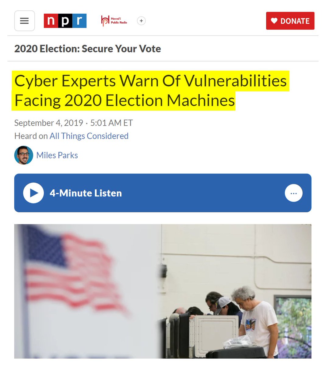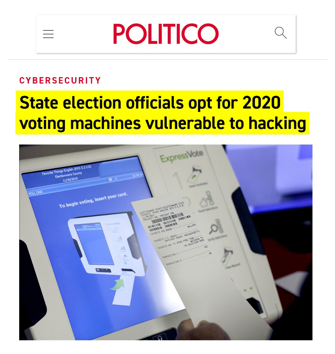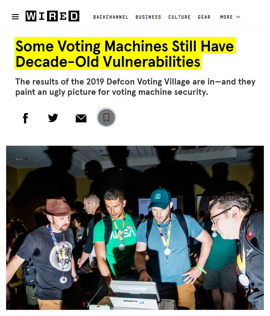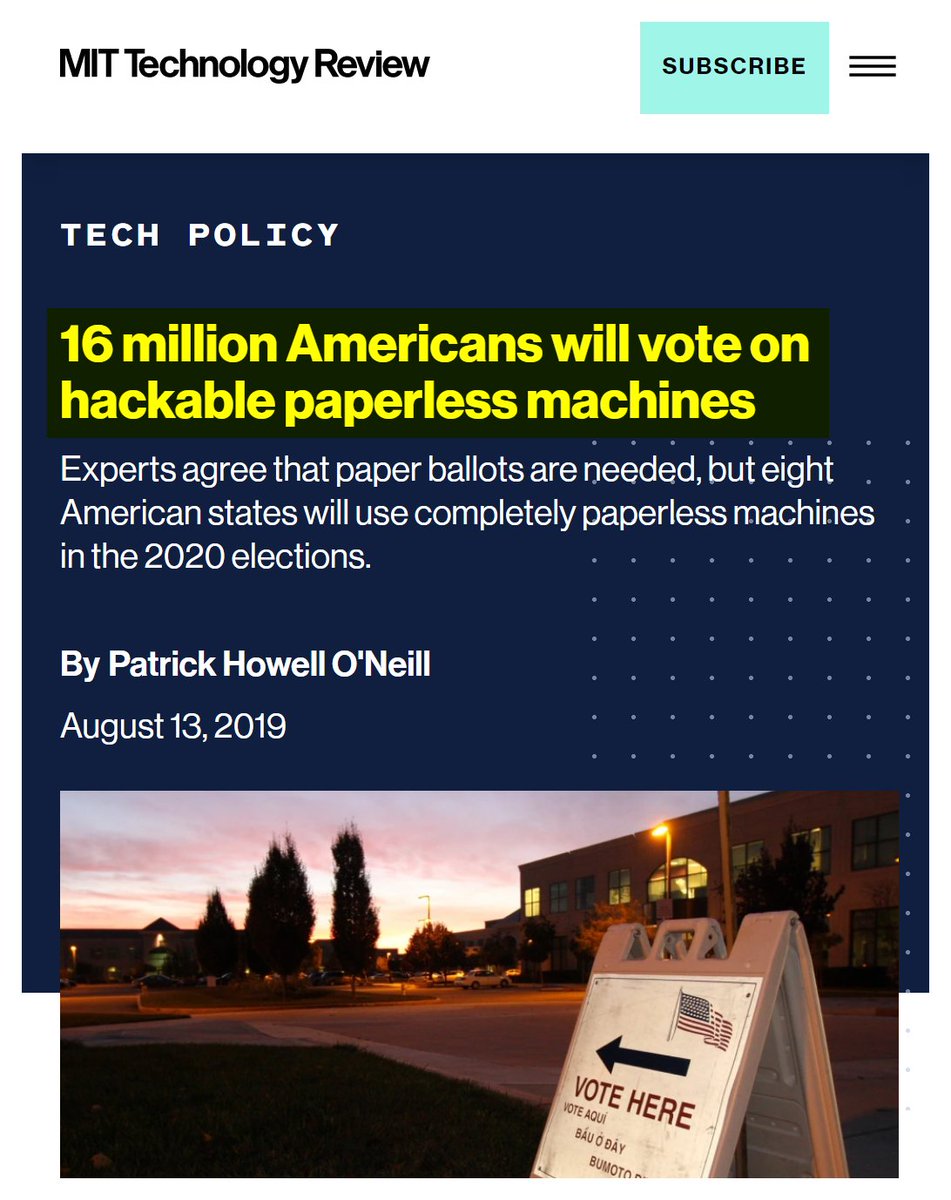 #67 NPR: Cyber Experts Warn Of Vulnerabilities Facing 2020 Election Machines (Sept. 4, 2019) "The machine he's investigating is a ballot-marking device used to help people with physical impairments or language barriers vote, and it's running a version of Windows that is more than 15 years old. "These systems crash at your Wal-Mart scanning your groceries. And we're using those systems here to protect our democracy, which is a little bit unsettling," he said. "I wouldn't even use this to control a camera at my house. Or my toaster." One glaring vulnerability — which cybersecurity experts have been talking about for 20 years, and yelling about for the past decade — are paperless voting machines. Experts agree that these machines are insecure because they record votes electronically and could either be manipulated or malfunction without detection. They can't truly be audited, and they leave room for some doubt in the result. In 2016, approximately 20 percent of voters used electronic voting equipment that didn't provide a paper trail. In 2020, that number will be around 12 percent, according to a recent report from the Brennan Center for Justice." https://www.npr.org/2019/09/04/755066523/cyber-experts-warn-of-vulnerabilities-facing-2020-election-machines