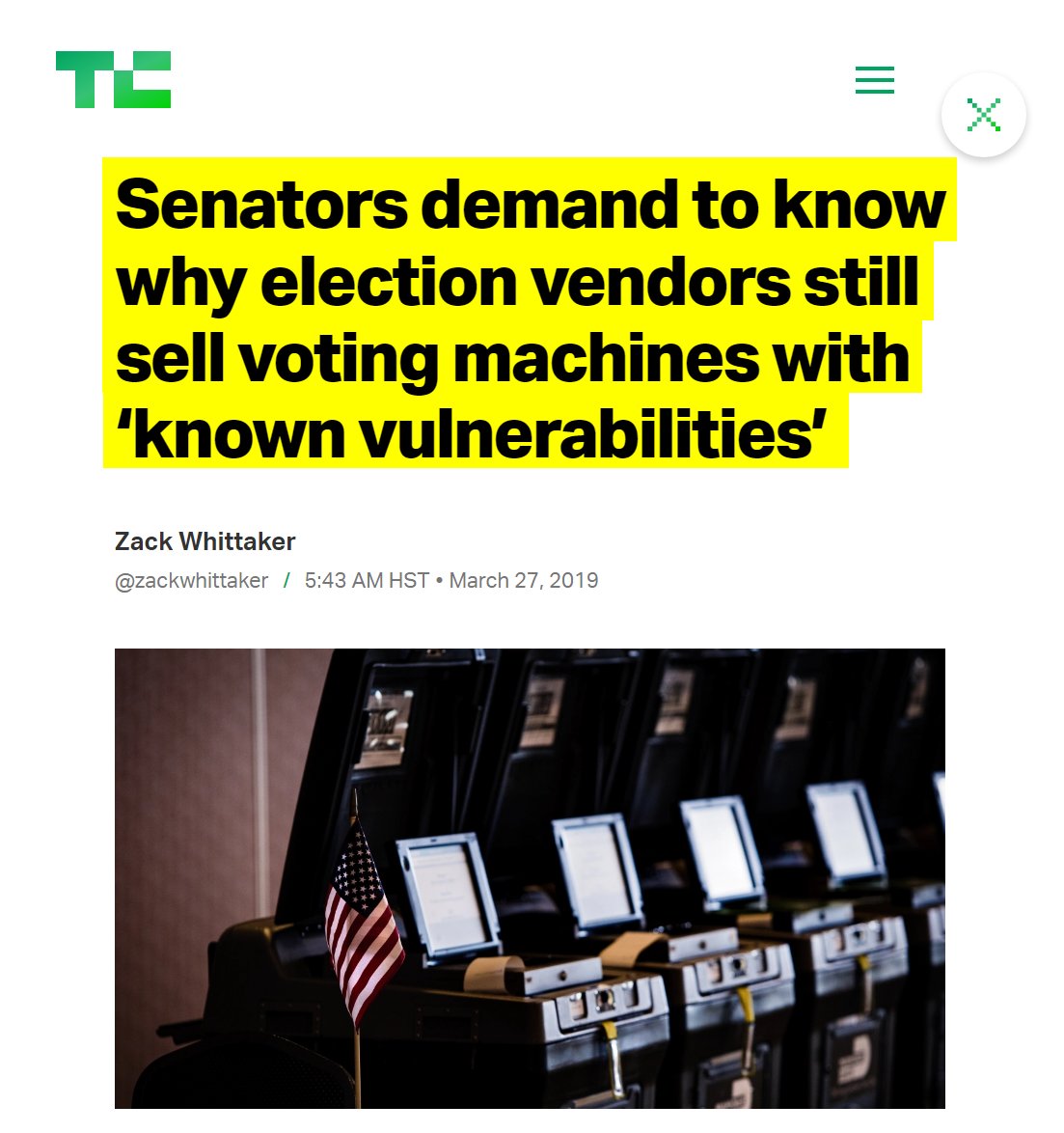 #59 TechCrunch: Senators demand to know why election vendors still sell voting machines with ‘known vulnerabilities’ (March 27, 2019) “The letter, sent Wednesday, calls on election equipment makers ES&S, Dominion Voting, and Hart InterCivic to explain why they continue to sell decades-old machines, which the senators say contain security flaws that could undermine the results of elections if exploited. “The integrity of our elections is directly tied to the machines we vote on,” said the letter sent by Sens. Amy Klobuchar (D-MN), Mark Warner (D-VA), Jack Reed (D-RI), and Gary Peters (D-MI), the most senior Democrats on the Rules, Intelligence, Armed Services, and Homeland Security committees, respectively. “Despite shouldering such a massive responsibility, there has been a lack of meaningful innovation in the election vendor industry, and our democracy is paying the price,” the letter adds. Their primary concern is that the three companies have more than 90 percent of the U.S. election equipment market share, but their voting machines lack paper ballots or audibility, making it impossible to know if a vote was accurately counted in the event of a bug. Yet, these are the same devices tens of millions of voters will use in the upcoming 2020 presidential election." https://techcrunch.com/2019/03/27/senators-security-voting-machines/