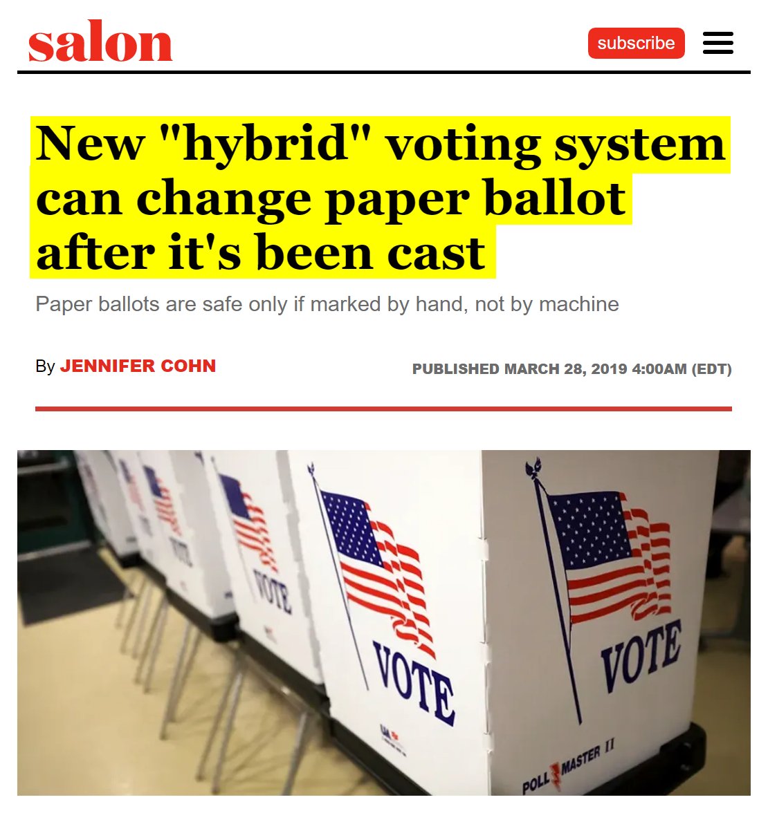 #60 Salon: New "hybrid" voting system can change paper ballot after it's been cast (March 28, 2019) “Unfortunately, there is no universal definition of “paper ballot,” which has enabled vendors and their surrogates to characterize machine-marked paper printouts from hackable ballot marking devices (BMDs) as “paper ballots.” Unlike hand-marked paper ballots, voters must print and inspect these machine-marked “paper ballots” to try to detect any fraudulent or erroneous votes that might have been marked by the BMD. The machine-marked ballot is then counted on a separate scanner. Most independent cybersecurity election experts caution against putting these insecure BMDs between voters and their ballots and instead recommend hand-marked paper ballots as a primary voting system (reserving BMDs only for those who are unable to hand-mark their ballots)… Unlike hand-marked paper ballots counted on scanners and regular non-hybrid BMDs, these new hybrid systems can add fake votes to the machine-marked “paper ballot” after it’s been cast, experts warn. Any manual audit based on such fraudulent “paper ballots” would falsely approve an illegitimate electronic outcome. According to experts, the hybrid voting systems with this alarming capability include the ExpressVote hybrid by Election Systems & Software, LLC (ES&S), the ExpressVote XL hybrid by ES&S, and the Image Cast Evolution hybrid by Dominion Voting. The potential for hybrid systems to add fraudulent votes without detection was identified by Professor of Statistics Philip B. Stark of UC Berkeley, an expert in postelection manual audits, in September of last year. At the time, he told TYT Investigates that the ExpressVote hybrid, which Johnson County, Kansas, had purchased a few months before the 2018 gubernatorial primary, could be maliciously programmed or hacked to create an entirely fraudulent machine-marked “paper ballot” because the machine includes an option that allows the voter to “AutoCast” the ballot without first printing and inspecting it. Moreover, as explained by Stark, the machine does not mark the ballot at all until the voter decides whether to exercise that option, which means that the machine receives advance notice of which ballots are “AutoCast” and thus safe to fraudulently mark. Another election expert, Computer Science Professor Andrew Appel of Princeton University, subsequently confirmed the existence of this stunning defect and dubbed it “Permission to Cheat.” Appel further reported that the ExpressVote XL and Dominion ImageCast Evolution include the same defect.” https://www.salon.com/2019/03/28/new-hybrid-voting-system-can-change-paper-ballot-after-its-been-cast_partner/