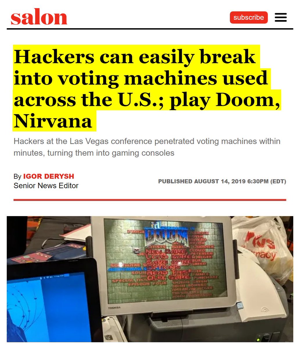#64 Salon: Hackers can easily break into voting machines used across the U.S. (Aug. 14, 2019) “Voting machines used in states across the United States were easily penetrated by hackers at the Def Con conference in Las Vegas on Friday…A video published by CNN shows a hacker break into a Diebold machine, which is used in 18 different states, in a matter of minutes, using no special tools, to gain administrator-level access… Hackers also quickly discovered that many of the voting machines had internet connections, which could allow hackers to break into machines remotely, the Washington Post reported. Motherboard recently reported that election security experts found that election systems used in 10 different states have connected to the internet over the last year, despite assurances from voting machine vendors that they are never connected to the internet and, therefore, cannot be hacked. The websites where states' post-election results are even more susceptible. The event had 40 child hackers between the ages of 6 and 17 attempt to break into a mock version of the sites. Most were able to alter vote tallies and even change the candidates' names to things like “Bob Da Builder,” CNN reported…. Sen. Ron Wyden, D-Ore., called for paper ballots that can’t be hacked. “Election officials across the country as we speak are buying election systems that will be out of date the moment they open the box,” Wyden said in a speech at the conference. “It’s the election security equivalent of putting our military out there to go up against superpowers with a peashooter.” A report by the Brennan Center for Justice at the NYU School of Law, released days after the conference, warned that 12 percent of ballots could be cast on paperless machines in 2020. The report shows that a third of all local election systems used voting machines that were more than a decade old. “We should replace antiquated equipment, and paperless equipment in particular, as soon as possible,” the report said… Rep. Ted Lieu, D-Calif., told Politico that the federal government “has a responsibility to make sure we have strong election security all over America. "It’s stupid to have the view that states have the right to have poor election security,” Lieu said. “No state has a right to have voting machines that can be easily hacked.” https://www.salon.com/2019/08/14/hackers-can-easily-break-into-voting-machines-used-across-the-u-s-play-doom-nirvana/