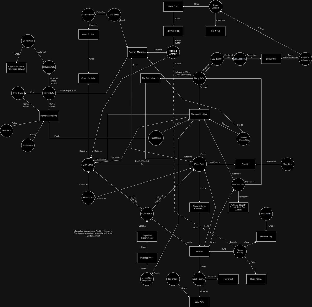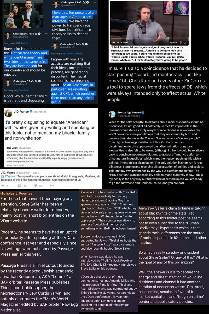 🚨🐸Nick Fuentes explains that Groypers advocate for nationalism, oppose Israeli interference, and disavow both legal and illegal immigration, but a subversion network is colluding to shape a post-Trump era defined by a colorblind meritocracy and Israeli occupation‼️ “After Trump cast doubt on the Iraq War wnd Israeli donors how do we intellectualize the new right after Trump destroyed the old one? It starts with Claremont. Claremont is funded by Straussians who are Zionists and Thiel, who is with Claremont, the CIA, backs Trump, and puts his people in the National Security apparatus. Darren Beattie, Mike Benz, and Anton. Claremont is funded by Singer, supports BAP, and backs all these people you see on the right. Like IM 1776 and other projects. We start to say the real vision of Trumpism is not colorblind meritocracy or multi-racial working-class populism. Not any of these other things that stress an open society. We said actually the true vision of Trump is nationalism, which must necessarily oppose the Israel lobby and foreign wars, free trade, and both legal and illegal immigration. We get censored on Twitter because Paul Singer’s Elliott Management is an activist investor in Twitter.” “Who is the heir apparent who gets to shape the post-Trump intellectual framework of the conservative movement after he leaves office? It’s JD Vance, who was at NatCon funded by Thiel, hosted by Hazony, attended by Yarvin and Ahmari. Vance spoke at the Quincy Institute, funded by the Open Society Foundation, Thiel and other donors. JD Vance receives all his money from Thiel. JD Vance has a personal relationship with Sohrab Ahmari , who worked for the New York Post, was a neocon, a former communist, and is now getting backing from the Open Society Foundation, Thiel, and Klingenstein. What Vance is promulgating, alongside Rufo and Ahmari, and BAP, and James Lindsay, is what they’re calling colorblind meritocracy. It’s not pro-white; it’s basically pro-Israel. They say that is going to be the intellectual successor, the intellectual heir to Trumpism. It is about recapitulating and redefining Trumpism. Vance is the VP, Trump is surrounded by Lubavitchers, Claremont shills, Thiel’s people, and Kushner’s people. They’ve recapitulated MAGA to mean colorblind meritocracy, individualism, a pro-Israel spin on America First. An occupation by Jewish billionaires with an allegiance to Israel. It’s Paul Singer, the pro-Israel Jew who backed George Bush in ’04, went against Trump, and funded the Steele dossier but now funds the Manhattan Institute, which took down Claudine Gay, and the Claremont Institute, which is creating your colorblind meritocracy consensus for the post-Trump right.” “Peter Thiel. Half his net worth in Alex Karp run Palantir, who gave Vance 15 million which made him a senator. You’ve got Tom Klingenstein, who backs Claremont and Compact, and Alex Soros, who backs Open Society, open borders, BLM, prosecutors, and Compact magazine. You’ve got Murdoch, who owns News Corp and Fox News, and supports Netanyahu’s PM campaign. Ackman used the plagiarism scandal to take down Claudine Gay because we can’t have free speech on an American university; it might convince Americans to stop sending guns to Israel to blow up Iran and Hamas. Michael Anton, who wrote Flight 93, Harry Jaffa’s mentor, Leo Strauss’ his mentor, and Thiel, and Yarvin, and René Girard, from whom they take their philosophy, which has a convenient interpretation for Jews. Rufo, Ahmari, Cofnas, IM 1776, and everybody affiliated with Claremont. The whole thing came undone, and we found out. Soros and Klingenstein and Thiel and Singer are all backing the same people. Even though they’re against or for authoritarianism, they all agree: open society, individualism, no anti-Semitism, no true free speech, gatekeepers on the right and left, no criticism of Israel. Vance the successor to steer the base back into neoconservatism, back into their colorblind, Jewish-blind meritocracy.”