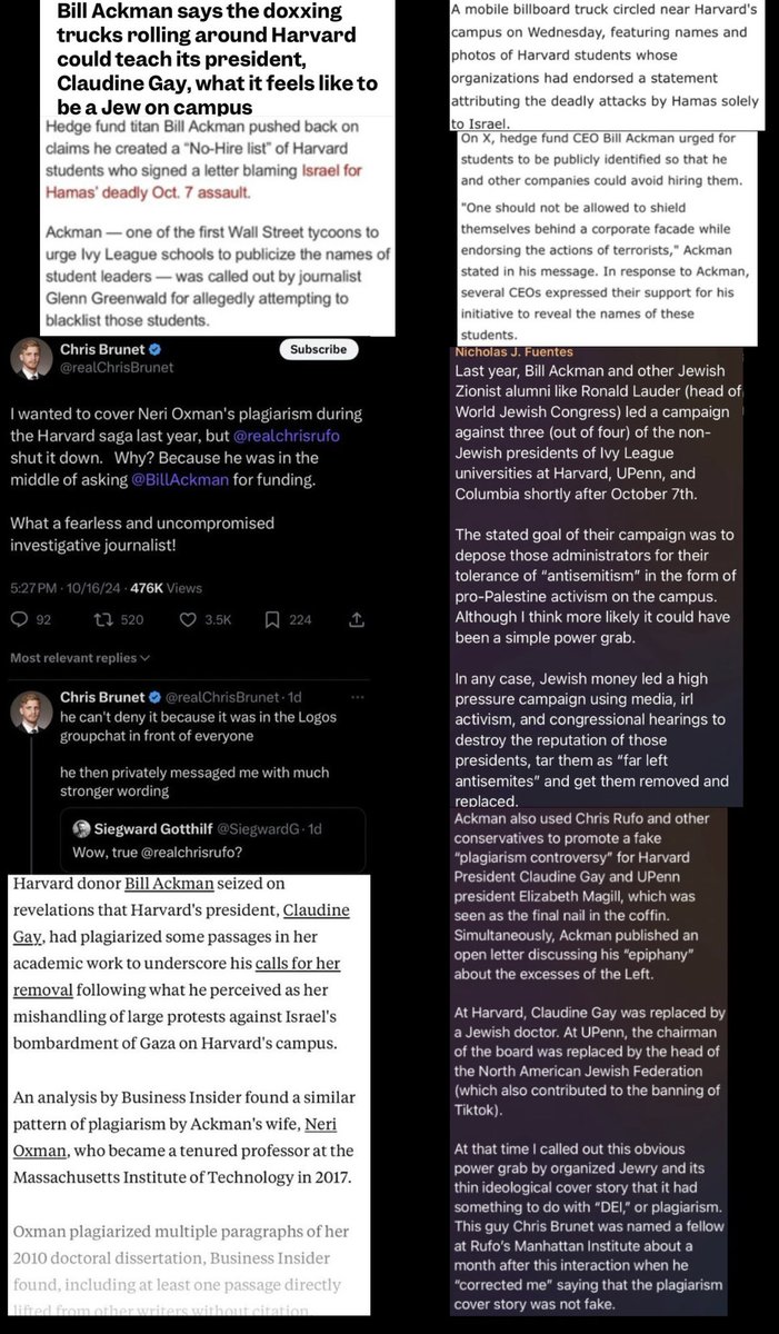 🚨🇮🇱Nick discusses how Israeli interests motivated the attack on schools, noting that the Manhattan Institute covered up a plagiarism story about Ackman’s wife and is funded by Paul Singer‼️ “TikTok was banned by Congress under pressure from the Jewish lobby. Anti-Semitism laws codify the definition of anti-Semitism in various states, deploying anti-Semitism monitors and interpreting civil rights law on campuses. These were two separate laws passed in Congress to shut down pro-Palestine protests. A group of students at Harvard who published an open letter justified the Hamas attacks, and there were major pro-Palestine demonstrations at Harvard. If there is a strain of pro-Palestine sympathy at Harvard, Israel must be deeply concerned, because that may be expressed in future generations of America’s elites. If the United States elite in both the private and public sectors did not have affinity with Israel, it could seriously compromise the aid that Israel relies upon for survival, as the most powerful country in the world needs to be their critical benefactor.” “Bill Ackman graduated from Harvard, and he is a Jewish Zionist. He is a major donor to Harvard and donates every year. He’s also a lifelong Democrat donor. Ackman began an activist campaign on the Harvard campus to shut down the protests on behalf of Israel. He coordinated in a group chat with over a hundred New York City elites, including other billionaires, the mayor, and members of the police force, to quash the protests. He organized with other billionaires, congressmen, media, and conservative activist groups to apply pressure on Harvard to shut down the activism. Ackman went after the president of Harvard, Claudine Gay, who is a DEI hire. She replaced the former Jewish president. So it was very clear that the goal of targeting Claudine Gay with this high-pressure campaign in media, Congressional hearings, and on-campus activism was about her refusal to shut down pro-Palestine activism.” “Claudine Gay resigned due to a plagiarism scandal that had been published about a year earlier by Chris Rufo and Chris Brunet, revealing that in her scholarship, she improperly cited some things. Ackman found the scandal and used it as a credible attack to pressure her to step down amidst a high-pressure activist billionaire campaign to force the resignation of three Ivy League presidents at Harvard, UPenn, and Columbia. The presidents were not Jewish, unlike others, and they entertained pro-Palestine activism. Chris Rufo, a senior fellow, and Chris Brunet worked for the Manhattan Institute, which is funded by Paul Singer, another Jewish, pro-Israel Zionist billionaire in the finance space who is an activist donor. His two big causes are gay rights and Israel. He is a mega-donor for Republicans like Bush and Trump.” “Brunet found out that Ackman’s wife, an Israeli-born Jewish academic, had heavily plagiarized in her scholarship as well. Claudine Gay improperly cited things; it was not technically plagiarism. Brunet discovered that Ackman’s wife had copied entire sections from Wikipedia and passed them off as her own. The Manhattan Institute told him he could not publish that piece. He was told in group chats and quite forcefully in private that he should not continue to explore that lead. At the same time they shut down a far worse plagiarism scandal, which would have implicated Bill Ackman’s wife, Rufo was seeking additional funding from Bill Ackman. After October 7th, Ackman shifted his party affiliation from lifelong Democrat to Republican and started giving to Republican causes. Suddenly, Paul Singer, a lifelong Republican, pro-Israel Jewish supporter of the Manhattan Institute, and Bill Ackman, a lifelong Democrat but also Jewish and pro-Israel, were suddenly supporting the same think tank and the same mission: to overthrow the Ivy League presidents who supported Palestine over Israel.”