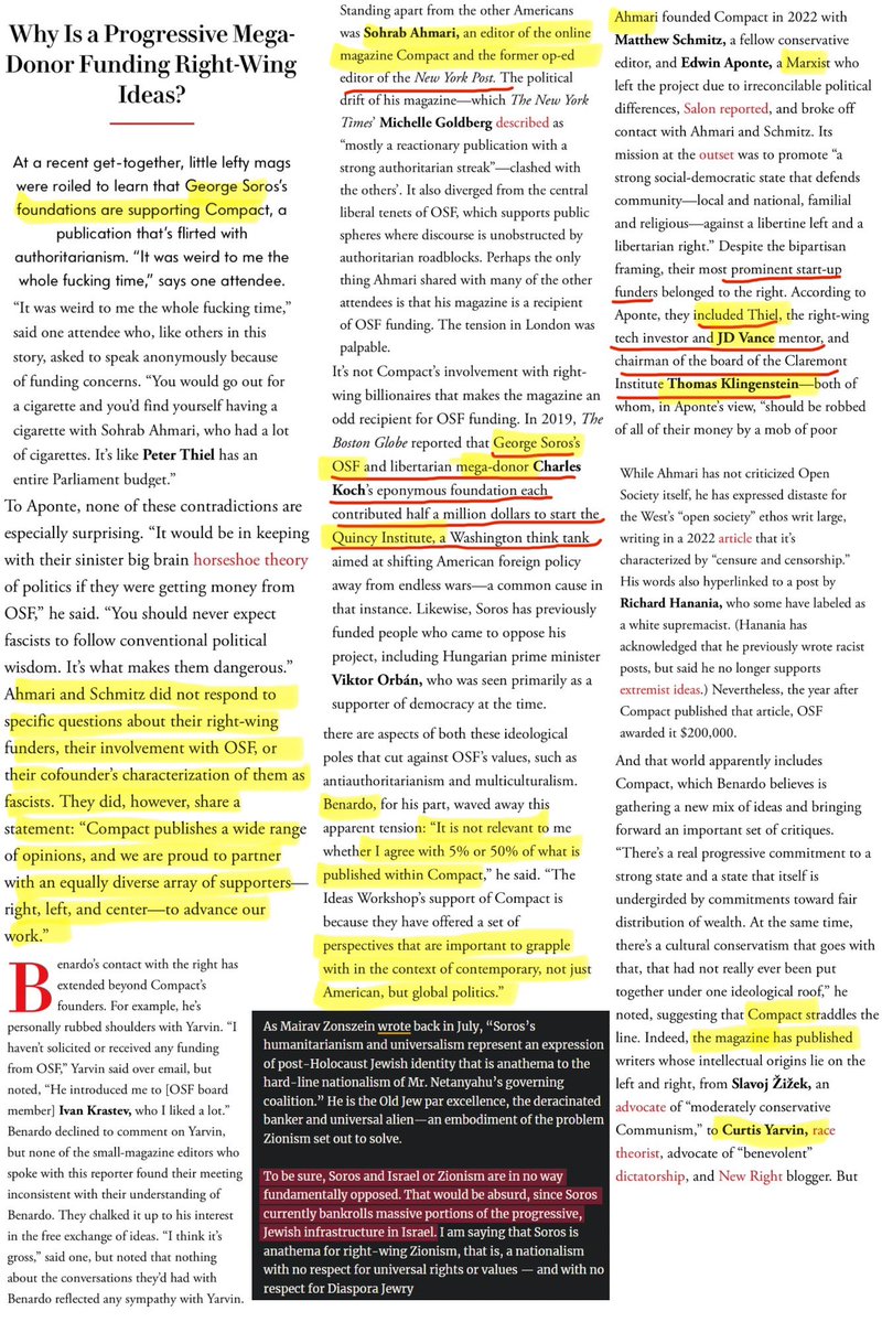 ✡️💰Nick Fuentes discusses who funds Compact to support Rufo’s call for censorship of any criticism of Jews while advocating for colorblindness and anti-racialism‼️ “Chris Rufo published this piece calling for the censorship of Groypers in Compact magazine, run by Sohrab Ahmari. Compact is funded by George and Alex Soros through the OSF. The Open Society Foundation takes its name from a book by a philosopher named Karl Popper, who said that the only way to prevent another Holocaust is to create an open society where there will be tolerance, diversity, pluralism, colorblindness, fair play, and individual rights. Karl Popper is the architect of what we would call globalism progressivism. Compact published Chris Rufo, who says we’re undermining fair play and colorblindness. Conspiracy theorists pointing to this Israeli-funded operation are abusing free speech, and they’re not legitimate opinions, and they must be crushed. Compact is authoritarian, which is confusing because the Open Society Foundation typically supports liberal tenets unless the discourse is anti-Semitic. Soros is not opposed to Israel. Soros is one of the biggest backers of Israeli causes. The difference is that Soros is a left-wing Israeli, so he supports progressives and liberals and leftists inside of Israel. He’s still an ardent Zionist; he just finds himself on the other side of a factional dispute with other Zionists.” “Rupert Murdoch, a backer of Netanyahu, owns Fox News and News Corp. The Likud party is the right-wing party; they’re in favor of a revision of Zionism, meaning expanding Israel’s territory through war. Before October 7th, there was the left, which opposed Netanyahu and his judicial reform, the one-state solution, and the solidification of Likud’s power over the state and the courts. Soros backs Netanyahu’s enemies. Netanyahu is tight with Viktor Orbán in Hungary. Soros backs opposition media in Hungary. Soros backs the left-wing opposition in Israel that’s protesting Netanyahu’s judicial reform. The political left and right are both funded by Jewish billionaires that are pro-Israel. They differ in their vision for the Israeli state. Soros pours billions of dollars into Israel; he just puts them behind progressive causes in Israel. American politics seems to be a proxy battle between the two sides of Israel’s politics because their billionaires put up the money for our politics.” “Compact is also funded by Peter Thiel and Tom Klingenstein. Half of Thiel’s net worth comes from Palantir. Jewish CEO Alex Karp flew the whole Board of Palantir to Israel after October 7th and said venture capital and private equity are coming together behind Israel. Palantir reserved 200 jobs just for Jews because of what’s happening to them. Thiel gave Vance $15 million to run in the Senate primary, securing Trump’s endorsement for J.D. Vance, which made him win the primary and become the senator and push Trump to make him vice president. Peter Thiel is one of the major backers for the Claremont Institute, which is one of the main think tanks providing that intellectual framework for a post-establishmentarian American right wing that Chris Rufo describes. Chris Rufo says after Trump blew up the institutions, there’s a vacuum, and now the right wing is figuring out a new intellectual consensus. The group that is figuring that out is one among them is Claremont, which is also backed by Paul Singer, who funds the Manhattan Institute. Tom Klingenstein is a major donor for the Claremont Institute and its current chairman. Compact magazine is funded by Alex Soros, Peter Thiel, and Tom Klingenstein. It’s funded by the OSF and Claremont, backed in part by News Corp publishing. Rufo says that we are poisoning the well for the post-establishmentarian right-wing consensus that’s being built after Trump with anti-Semitism and racialism.”