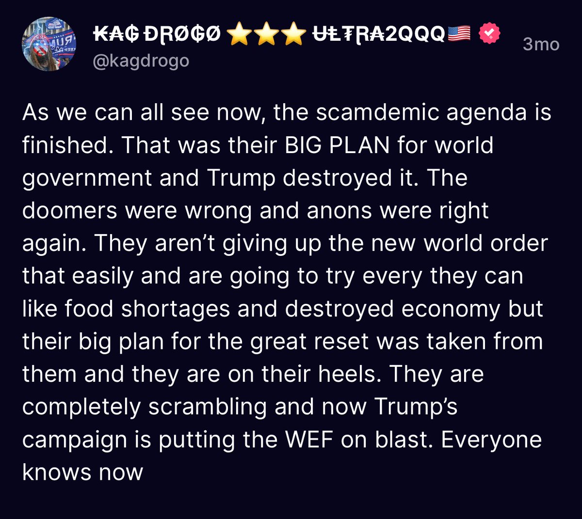 It shouldn't be very difficult at this point to consider the #5GW strategy of Trump's approach to the vaccine roll out. Rushing it out is exactly what stopped the great reset's full implementation. Speaking out on the vax injuries would give them the perfect justification to manipulate the flu/"covid" cases again and try for a bigger and longer lockdown. Trump speaking out against the vax would be the dumbest strategy at this stage and the instant gratification would be insignificant compared to the fatal countermove it would give to the cabal. It would completely compromise the 5GW strategy with warpspeed - which is exactly what stopped their depopulation fema camp end game agenda. Some people don't even understand the bullet we dodged thanks to @realDonaldTrump He is a hero. The fact we can sit here and talk about this today, while not in a fema camp, is a testament to the success of Trump's strategy. Most of the doomers I know only just recently found out about the New World Order so they aren't able to see as easily how Trump is already stopping the "great" reset. Those of us that have known about the NWO for over a decade feel a great sense of relief at the way things have played out. If it wasn't for Trump, we’d already be in the camps. Their scamdemic narrative is completely obliterated and that was their BIG PLAN for world government. The People are AWAKE. They will never be able to do this again. Look around you, their scamdemic plan has been CRUSHED. “Emergency” officially ended. They are running multiple back up plans at once and are increasingly desperate. Trump stopped the New World Order with warpspeed. That’s right. Right now [they] are trashing around in their dying breaths of panic. Many people have no idea how bad the scamdemic was supposed to be. The defiant ones were supposed to already be depopulated. Their great reset into eating bugs, sleeping in pods in the 15 minute city, tracked with barcode tattoos, social credit scores and CBDC was meant for the sheep who survived AFTER the defiant had been disappeared. By Trump releasing the vax quickly, it ended tyrannical Governors’ excuse for lockdowns and removed their cover for the great reset with a destroyed economy. We know he already ended their wars and removed the camouflage that would have given them. It also forced them to release a vax under EUA that CANNOT be forcibly mandated, try as they did. That’s why they had to use incentives. It forced them to rush their agenda, which makes it way more visible than their usual slow incremental boiling water tactics, making so many mistakes and exposing themselves in the process. We all know every single time the vax is mentioned, President Trump emphasizes freedom of choice- he’s said no one should be forced and we have our freedoms. He says this repeatedly, every time, without exception. Every single time. He’s always been outspoken against mandates. Most people don’t even realize how huge that was. (Every President before was lockstep with the uniparty pushing the new world order and all pushed mandates.) He’s already said no kids should take it. We all know that all the face diaper parents would have injected their kids with rNA GMOs no matter what Trump said. If President Trump were to speak up about the injuries- they could seize on that opportunity with the countermove of locking us down again and blaming the injuries on Trump rushing the vax. Just look what they did when he mentioned HCQ- We’d hear an all out media tirade about how the injuries are Trump’s fault because he rushed it and if it wasn’t for him they’d be “safe and effective.” Not to mention, they’d leverage the Trump derangement syndrome they’ve created and associate ANY criticism of the injection agenda as “just a Trump supporter thing.” By removing himself from the equation, they didn’t have that card to play, even though they still try, it’s uniting people across the spectrum. By not saying anything, he’s forcing them into showing their hand to the entire world while it wakes up average everyday people everywhere. 15 years ago when I used to try and tell people there was a nefarious plan to fake a pandemic in order to force vaccinate (depopulate) the world and implement a totalitarian world government for the survivors — people thought I was crazy. Today this has become common knowledge. Trump has destroyed the media’s credibility and woken up regular people everywhere. As tragic as this is, with all the vax injuries and deaths, it’s the best possible timeline and way better than it would have been — which was everyone being forcibly vaccinated against their will without a choice. Trump gave us the choice to peacefully refuse without having to fight or run. The way that I and many folks were expecting this to happen 15 years ago, when we all thought they were going to make their big move with “swine flu” — was them going door to door to force this thing into people with the enforcement of the police and if you didn’t take it you’d be put on a bus and carted off to a quarantine camp, never to be heard from again. Don’t believe me? Look at China and Australia. That’s just not happening and there’s no way it can at this point- not only we’re they forced to end the scamdemic but now way too many people are awake worldwide. If it weren’t for Trump, they’d have already been rounding people up into fema camps and we would have long since lost National sovereignty to the totalitarian global government New World Order, now called the “Great Reset.” Warpspeed stopped that. When he says it saved millions of lives it’s because it DID - from the death camps. Now he is going to completely obliterated the deepstate. Watch what happens next. #TRUMP2024 #TrumpIsTheOnlyChoice https://truthsocial.com/@kagdrogo/109717329631536809…