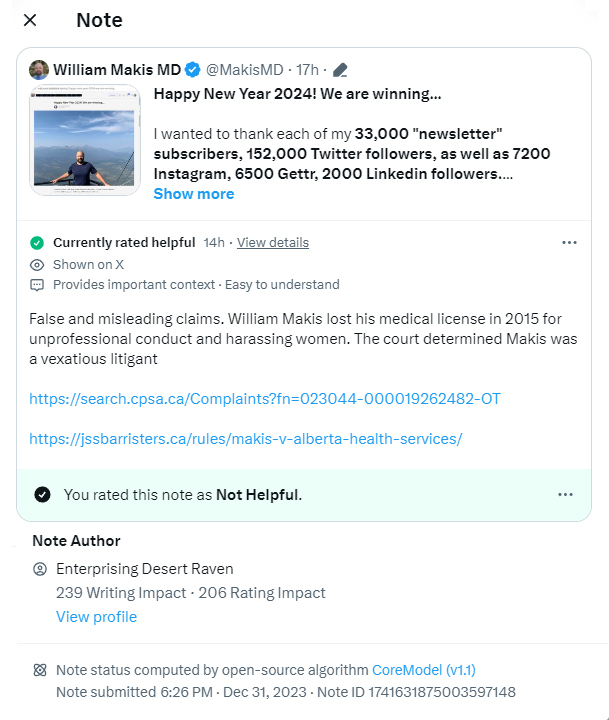 This is defamation @elonmusk. @CommunityNotes are now engaging in defamation. For any lawyer interested - this is a easy multi-million dollar case. Let me address this fraudulent "Community Note". I have never harassed anyone in my life, and my license was not "lost in 2015". In 2015, former Alberta Health Services CEO Dr.Verna Yiu (@DrYiu_verna) conspired to illegally shut down my Cancer Treatment Program in Edmonton, Alberta (Cross Cancer Institute) which was curing end stage Neuroendocrine Cancer in 90% of patients. It was Clinical Trial NCT01876771 and was the largest of its kind in North America. The illegal sabotage of this Clinical Trial would inflict bodily harm or death on more than 2456 Alberta Cancer patients. In 2017, AHS CEO @DrYiu_Verna offered me a $400,000 bribe, in return for signing a non-disclosure agreement about the sabotage of my cancer program and murder of my cancer patients. I refused the bribe. Within 6 hours of my refusal, College of Physicians and Surgeons of Alberta @CPSA_CA took my medical license #023044 hostage and started threatening my family & my children. They threatened & extorted my family for 1.5 years, claiming they would destroy my professional reputation and my medical career if I didn't sign that deal with Alberta Health Services. They claimed: "we will punish your family financially". I reported these threats to @edmontonpolice Chief Rod Knecht who opened an EPS Criminal Investigation File #18-132308, but it was covered up by EPS Detective Kevin Schindeler Reg#2049 who protected CPSA and AHS Officials. After I refused CPSA's threats to settle with AHS, they cancelled my medical license on Feb.12, 2019 for "non-payment" of College fees, which included a $75,000 "administrative penalty" they were extorting my family with, to get me to sign the non-disclosure agreement with AHS. This license cancellation is still recorded on the College website. Over the period 2015-2022, Alberta Health Services CEO @DrYiu_Verna murdered or inflicted bodily harm on 2456 Alberta cancer patients, with many more dying because they couldn't access life saving treatments in the Clinical Trial after it collapsed in 2017. It is the greatest healthcare scandal in Alberta history, and probably Canadian history. This scandal involves many politicians (including @RachelNotley & @jkenney who provided funding to AHS in the millions of dollars to cover up these patient murders), and it involves many other prominent leaders in Alberta. They murdered or inflicted bodily harm on 2456 Alberta cancer patients. And I have over 50,000 pages of documents to prove it. Including names. I will be exposing all the details of this scandal in 2024, which involves many Alberta Judges as well, each of whom I will name, and the exact role they played in this scandal. I have never shown the $400,000 Alberta Health Services bribe before, but here it is. It was authorized by former Alberta Premier @RachelNotley & her Alberta Ministry of Health, led by Sarah Hoffman in 2017. It has been under a total Alberta media blackout for 6 years now. No one will dare report on it. @DrYiu_Verna, after murdering or inflicting bodily harm on 2456 Alberta cancer patients, was recently appointed Vice President of University of Alberta @UAlberta, as announced by President @BFlanaganUofA who is deeply involved in this AHS scandal personally. Who else is involved? Entire leadership of Alberta Health Services Entire leadership of @CPSA_CA Several officials of @AlbertaDoctors Law Society of Alberta @LawSocietyofAB A number of top Alberta Law Firms including Bennett Jones, Gowling WLG, Field Law LLP, Shores Jardine LLP, CMPA, etc. A number of prominent Alberta Judges including Chief Justices at both Court of King's Bench and Court of Appeal who have been committing fraud in Court for 5 years now, on behalf of AHS and CPSA, to help them cover up these patient murders. Much more to come in 2024. This is only the beginning of what I will expose. @ABDanielleSmith @AdrianaLagrange @GoAHealth @YourAlberta @CBCEdmonton @ctvedmonton @EdmontonJournal @SunRickBell @CityNewsYEG @GlobalEdmonton #cdnpoli #ableg #abhealth