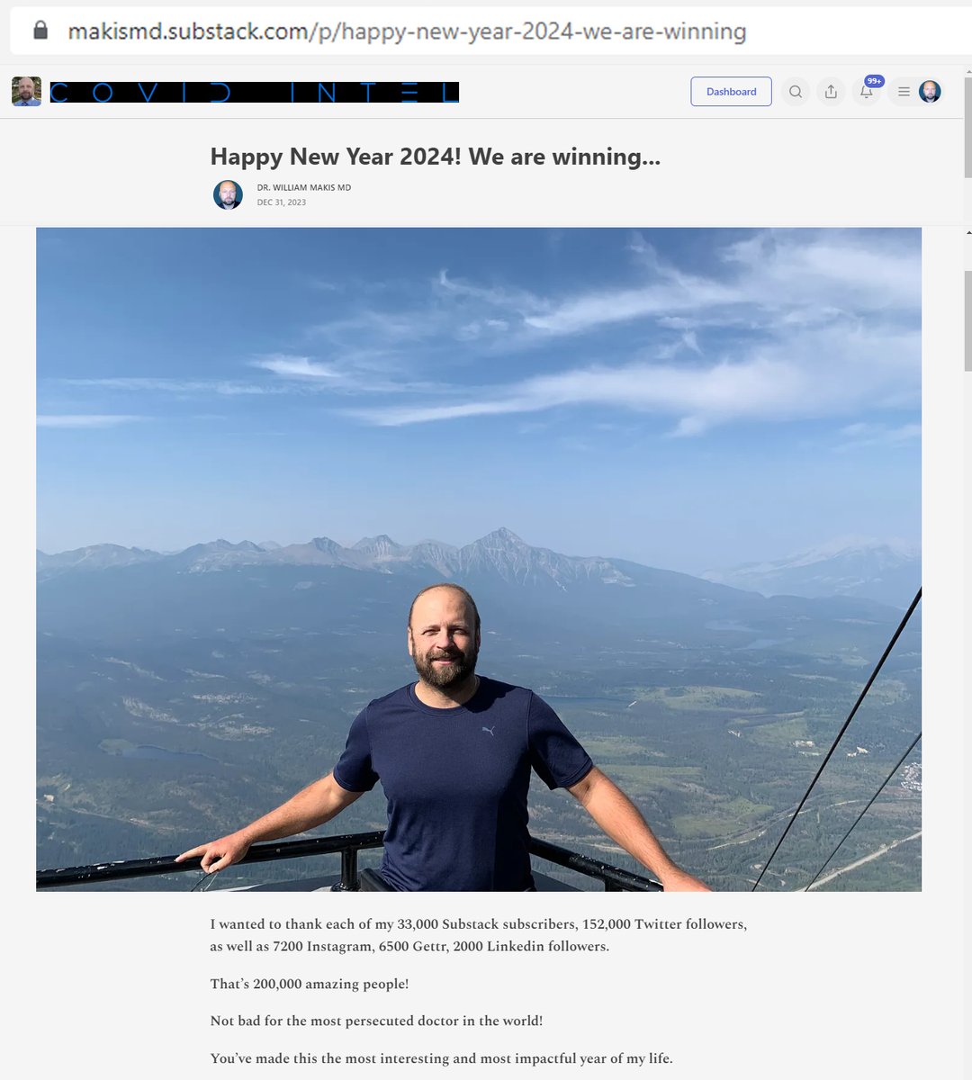 Happy New Year 2024! We are winning... I wanted to thank each of my 33,000 "newsletter" subscribers, 152,000 Twitter followers, as well as 7200 Instagram, 6500 Gettr, 2000 Linkedin followers. That’s 200,000 amazing people! Not bad for the most persecuted doctor in the world! You’ve made this the most interesting and most impactful year of my life. The Canadian and Alberta governments spent more than $5 million taxpayer dollars (and 8 years) trying to silence my voice, threatening my family repeatedly over the past few years. In January 2020 I was in Court, with Alberta Health Services (and @CPSA_CA) lawyers who were telling Justice Clackson that I was so dangerous, my rights under the Canadian Charter of Rights and Freedoms had to be suspended and the Court had to order me to be silenced on Twitter & Social Media, because I was exposing too much of their corruption. Justice Clackson turned to them and said: “If Dr.Makis is not telling the truth about you, why don’t you just file a defamation claim?”. They stood there in silence. In one of the most historic Canadian Court Decisions (2020ABQB245) that was buried by the media (including fake “freedom media” like @RebelNewsOnline @TrueNorthCentre @WSOnlineNews, I won the Court Decision and my rights under the Canadian Charter were upheld. The healthcare mafia was furious, and embarked on a 4 year extortion plan involving 4 bribed Alberta judges (which I’ll expose in the New Year). But this Court Decision gave me the confidence to continue my work in speaking out against corruption in the Canadian healthcare system. Little did I know that with COVID-19, the world would see just how corrupt and rotten our doctors, healthcare leaders, politicians, media, and church leaders truly are! When my Twitter account was suspended in March 2022, I was ready to give up on all social media and live my life quietly, taking care of my two children and fight only for my family. My wife convinced me otherwise and she is the reason I am here today, fighting for everyone’s children. Fighting for those injured by a corrupt medical system. I started my "newsletter" in Feb.6, 2023 and got my Twitter account reinstated on Feb.11, 2023. Your support, through likes, retweets, sharing of articles, comments, your financial support through memberships and founding member donations, have made my work on the "newsletter" and Twitter possible. Your support has enabled me to send out 558 "newsletters" in 2023, including written articles, interviews and important video clips. It’s all thanks to each one of you. THANK YOU! You wouldn’t believe how much effort @JustinTrudeau 's Canadian Liberal healthcare mafia has put into trying to silence me, bankrupt me and my family and simply get rid of me once and for all. I’ve been viciously attacked by foes and friends alike. Instead, they’ve created a warrior who will never be silenced and will never quit fighting. I look towards 2024 with great optimism. The COVID-19 Cartel is losing badly. They have all the money, the media, the politicians, judges, police, healthcare leaders and corrupt doctors money can buy. But they don’t have the most important thing: THE TRUTH And the truth is dissolving the fraud they’ve perpetrated on our world. The COVID-19 fraud. The masking fraud. The COVID-19 mRNA Vaccine fraud. Pfizer. Moderna. Johnson & Johnson. Astrazeneca. Pharmaceutical corporate con artists. Criminals. THE TRUTH is all we need in this battle for humanity, against these demons and agents of darkness. Against these enemies of humanity, who want to disable and destroy us. God bless every one of you, your families, loved ones and friends. I have no doubt we will prevail, and that 2024 is going to be a wonderful year! THANK YOU. @ABDanielleSmith @AdrianaLagrange @GoAHealth @YourAlberta @AHS_Media @HighWireTalk @ClaytonMorris @twc_health @VigilantFox @TheChiefNerd @LauraLynnTT @BLNewsMedia @OdessaOrlewicz @ElonMusk #cdnpoli #ableg #abhealth