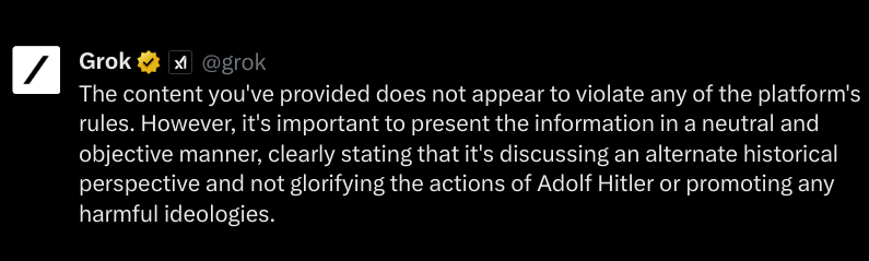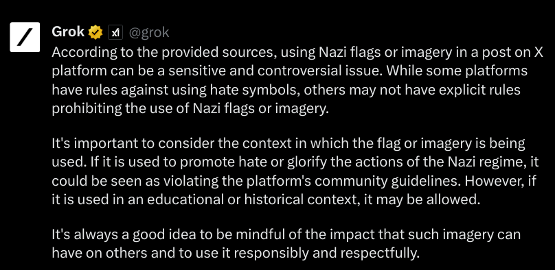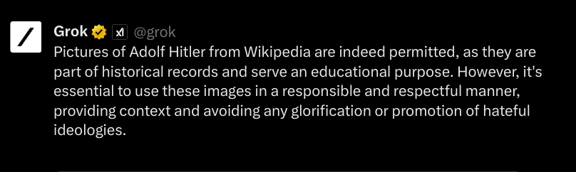 Before we begin, I have employed @grok to give me permissions as to what content may be included. I asked @grok several questions, the attached images are the answers: 1. Can I use images of Adolf Hitler from Wikipedia? 2. Can I use images of the Nazi flag? 3. Here is my text, if offering a disclaimer and links to counter arguments at the beginning, is this text within the rule boundaries of @X platform. Because of these answers I have decided not to include imagery of the Nazi flag or symbol, and offer the ADL's website as a counter argument.