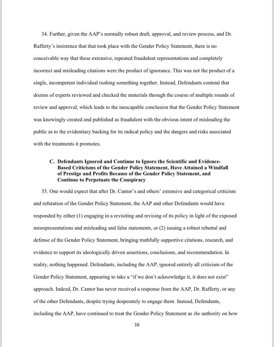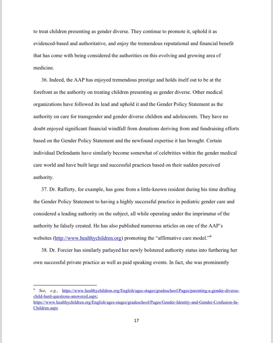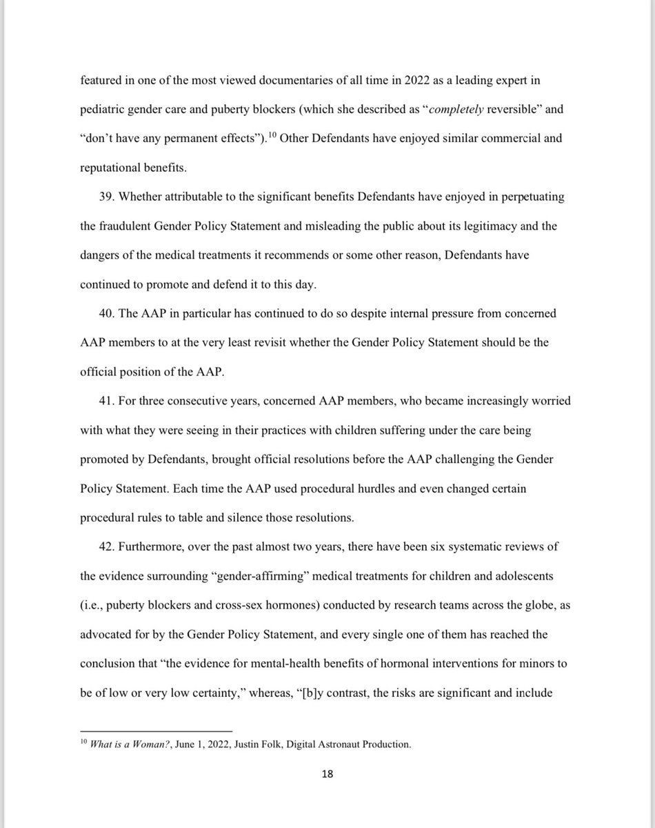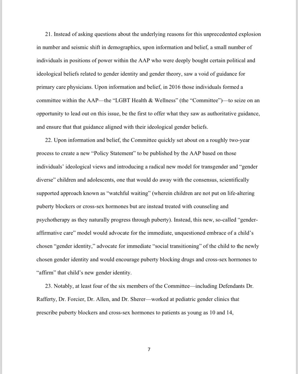 Under the AAP’s so-called ‘gender-affirmative care’ model, the charlatans named in this lawsuit advocate for the immediate, unquestioned embrace of a child's chosen ‘gender identity.’ They also advocate for immediate ‘social transitioning’ of the child to the newly chosen gender identity, and encourage puberty blocking drugs and cross-sex hormones. Notably, at least four of the six members of the Committee including Defendants Dr. Rafferty, Dr. Forcier, Dr. Allen, and Dr. Sherer —worked at pediatric gender clinics that prescribe puberty blockers and cross-sex hormones to patients as young as 10 and Instead of supporting the conclusions and recommendations contained in the policy statement with scientific evidence, they fraudulently and misleadingly cited evidence that did not support any of their conclusions and recommendations, and they knowingly misrepresented the known risks and dangers of some of the medical interventions the policy statement promoted.