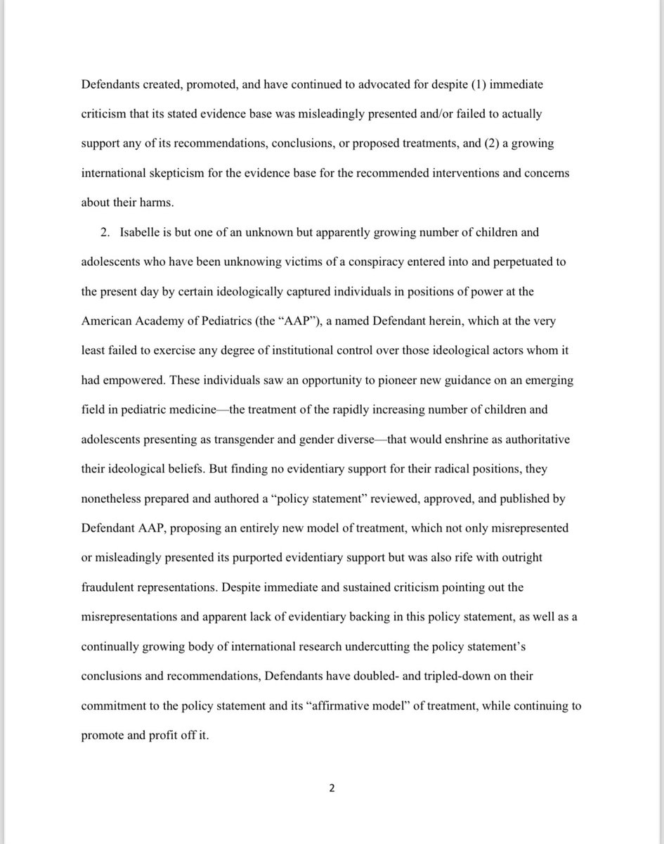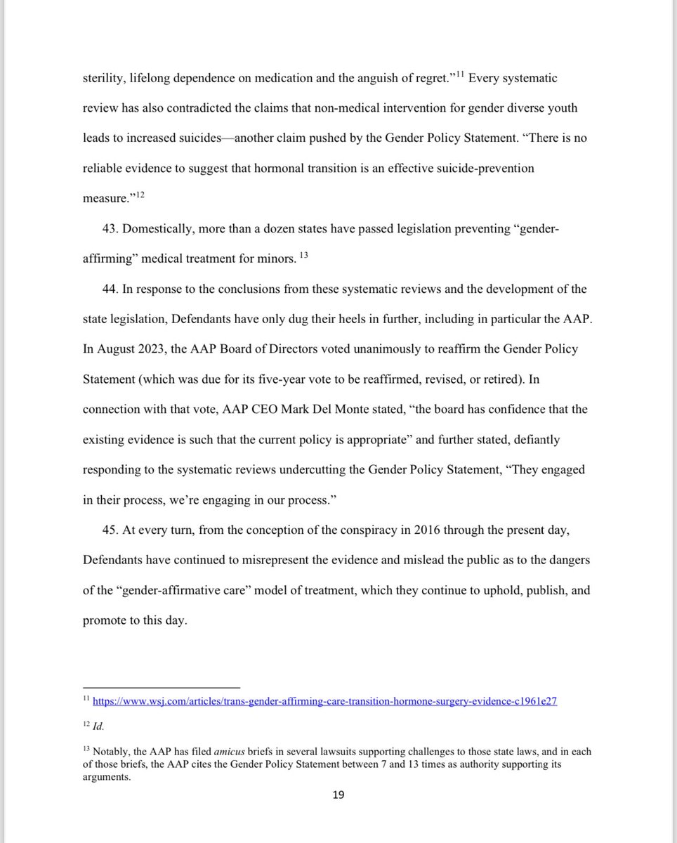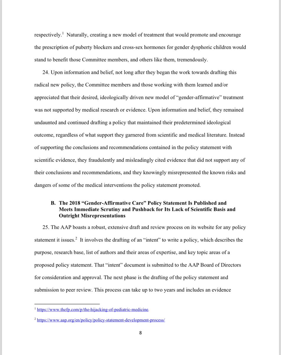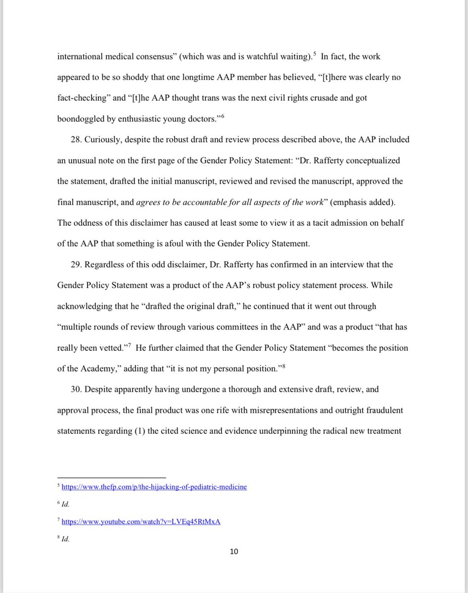 Under the AAP’s so-called ‘gender-affirmative care’ model, the charlatans named in this lawsuit advocate for the immediate, unquestioned embrace of a child's chosen ‘gender identity.’ They also advocate for immediate ‘social transitioning’ of the child to the newly chosen gender identity, and encourage puberty blocking drugs and cross-sex hormones. Notably, at least four of the six members of the Committee including Defendants Dr. Rafferty, Dr. Forcier, Dr. Allen, and Dr. Sherer —worked at pediatric gender clinics that prescribe puberty blockers and cross-sex hormones to patients as young as 10 and Instead of supporting the conclusions and recommendations contained in the policy statement with scientific evidence, they fraudulently and misleadingly cited evidence that did not support any of their conclusions and recommendations, and they knowingly misrepresented the known risks and dangers of some of the medical interventions the policy statement promoted.