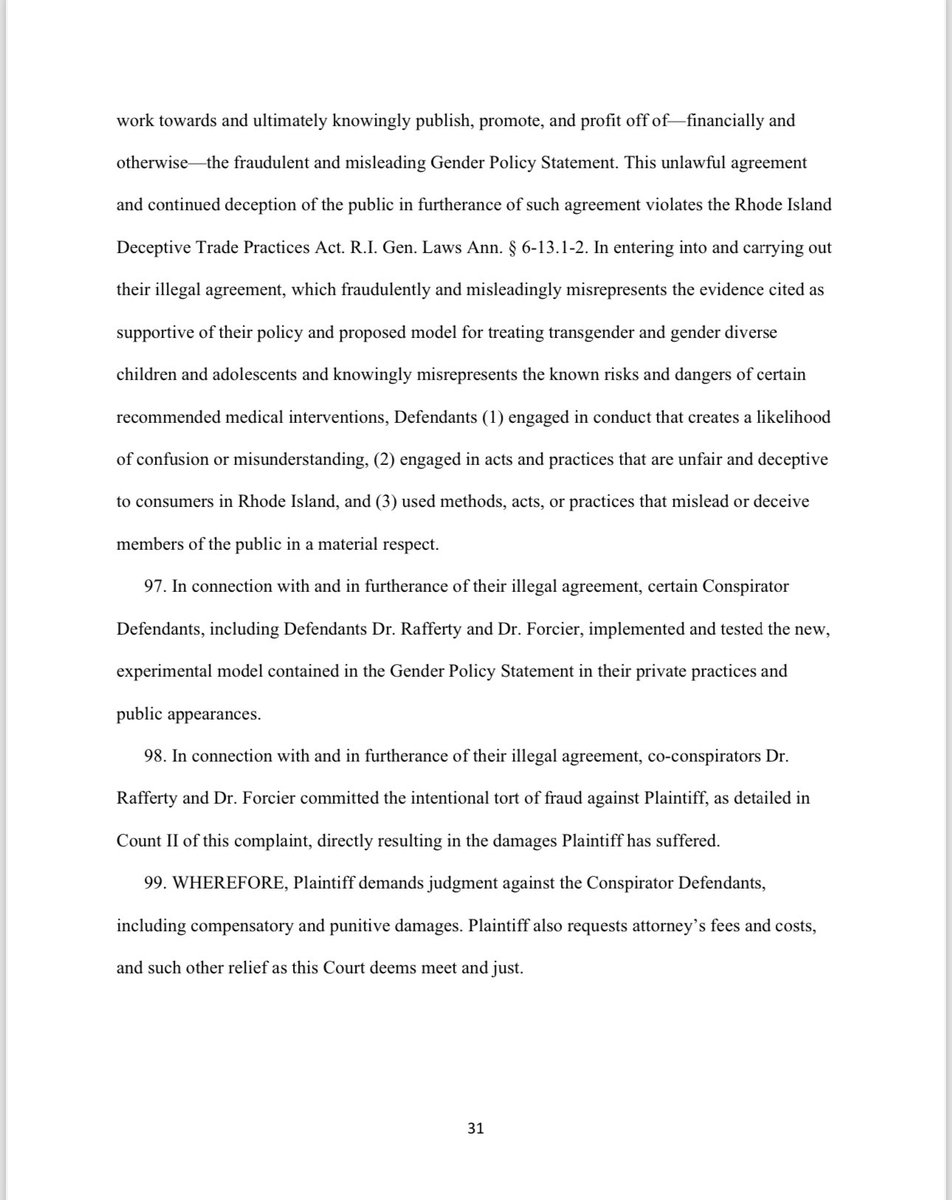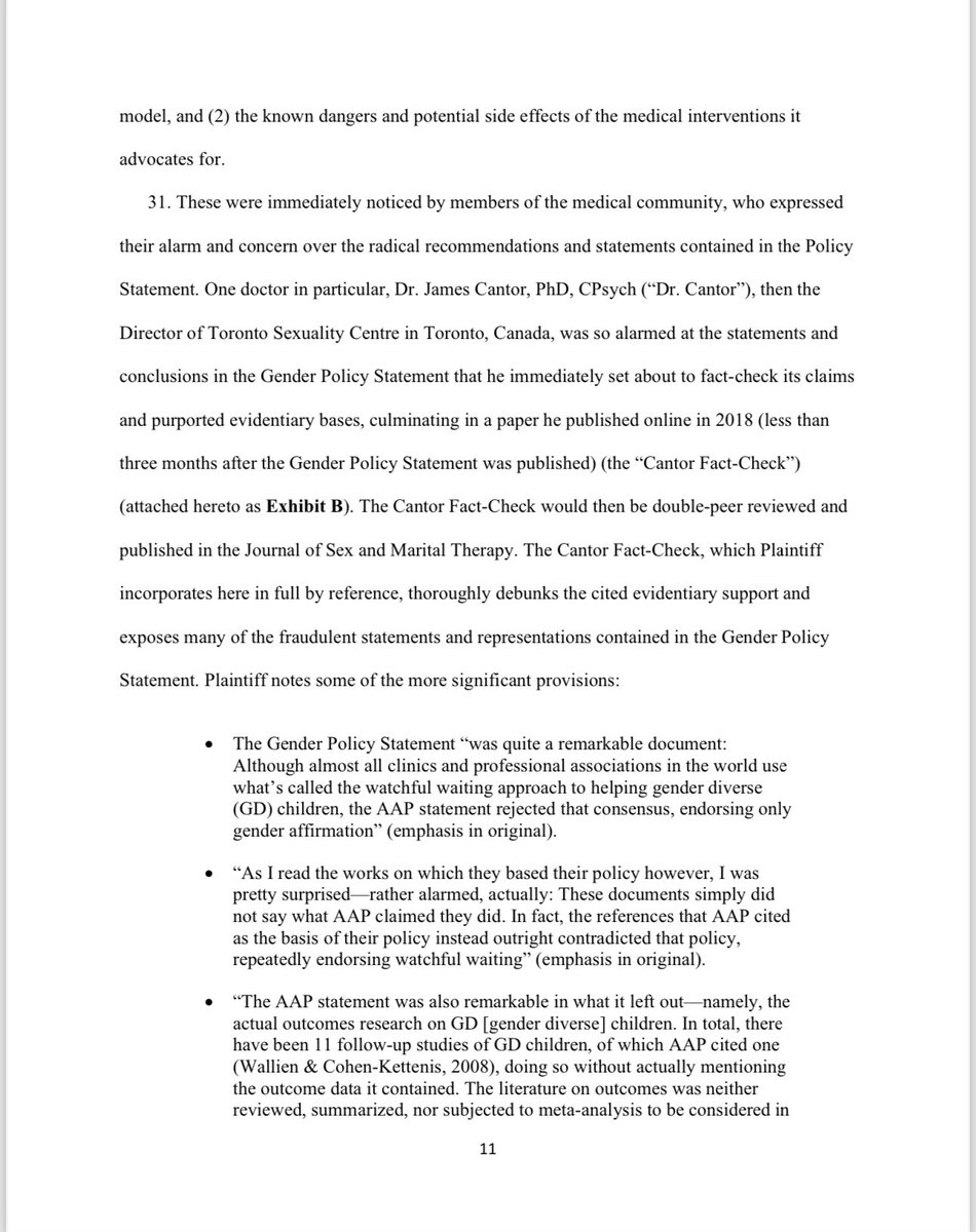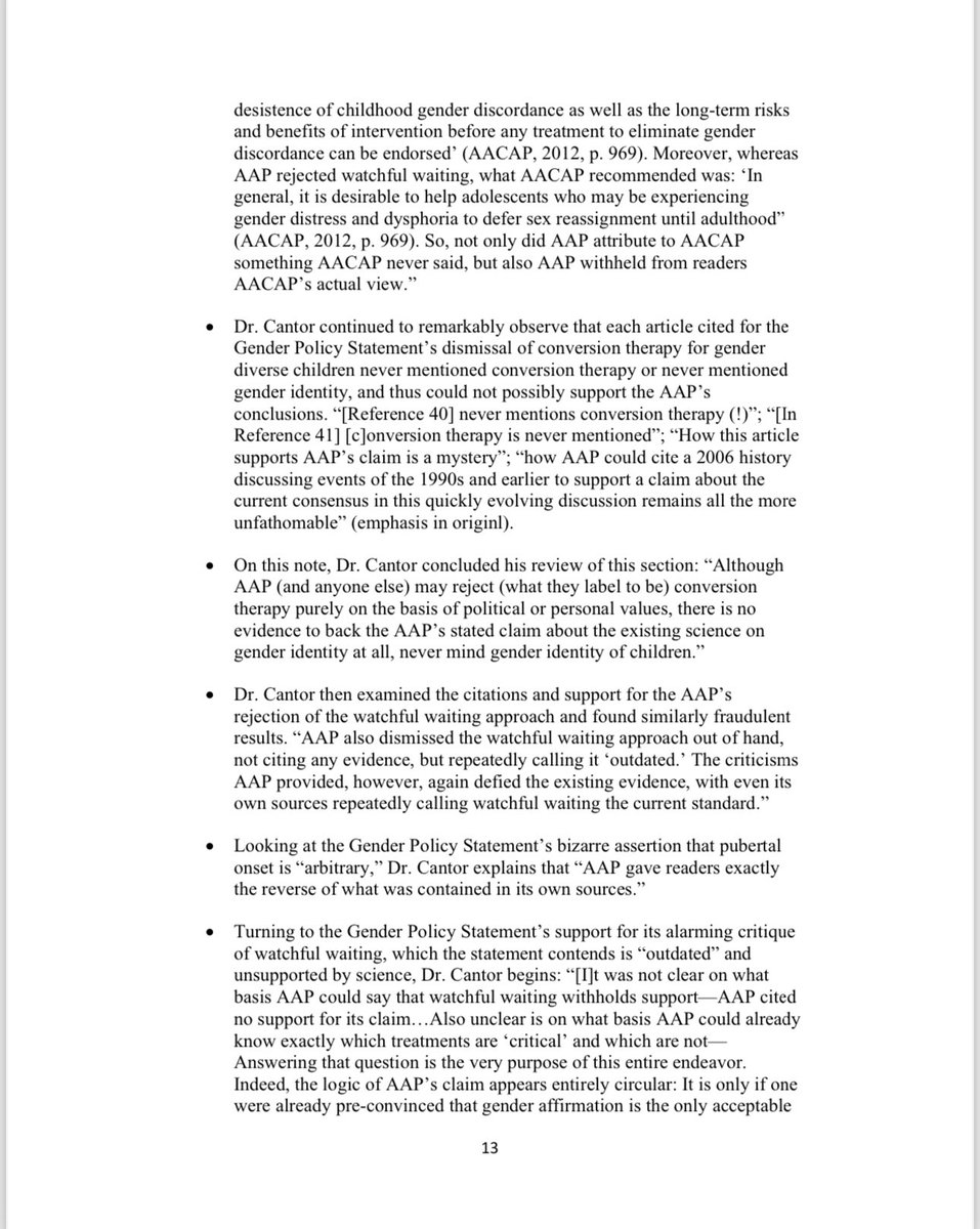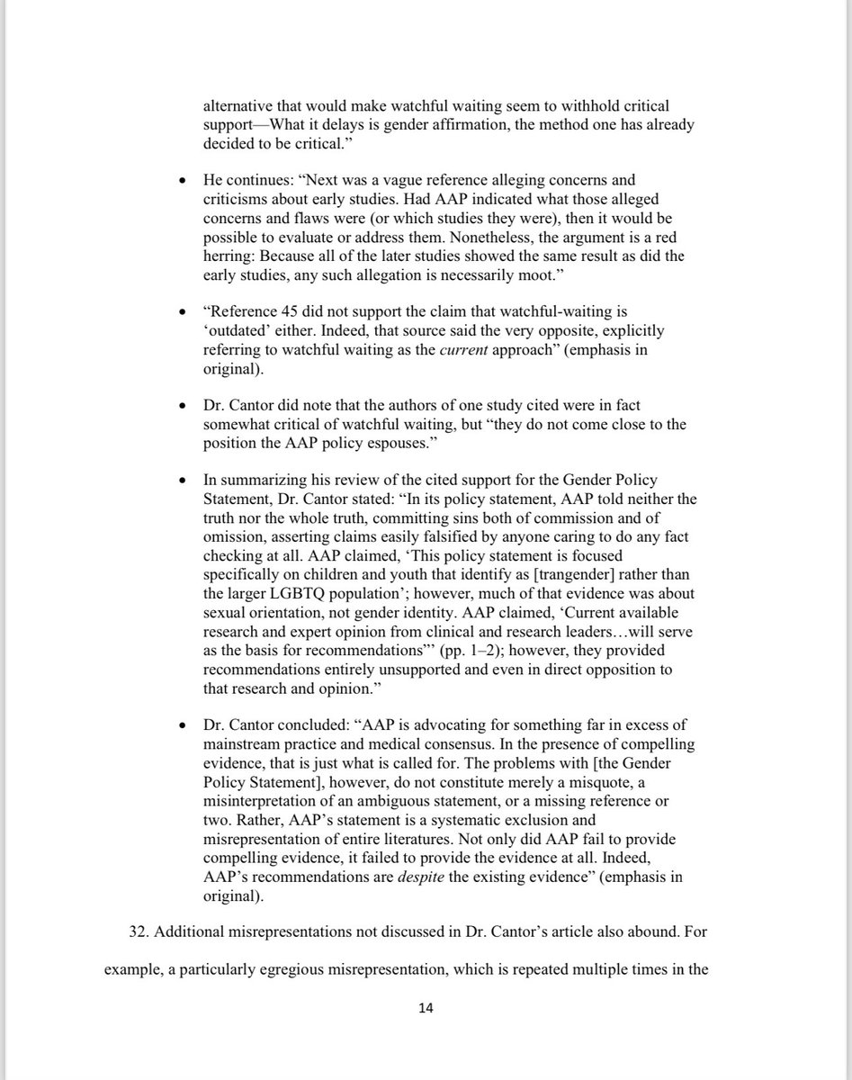 Under the AAP’s so-called ‘gender-affirmative care’ model, the charlatans named in this lawsuit advocate for the immediate, unquestioned embrace of a child's chosen ‘gender identity.’ They also advocate for immediate ‘social transitioning’ of the child to the newly chosen gender identity, and encourage puberty blocking drugs and cross-sex hormones. Notably, at least four of the six members of the Committee including Defendants Dr. Rafferty, Dr. Forcier, Dr. Allen, and Dr. Sherer —worked at pediatric gender clinics that prescribe puberty blockers and cross-sex hormones to patients as young as 10 and Instead of supporting the conclusions and recommendations contained in the policy statement with scientific evidence, they fraudulently and misleadingly cited evidence that did not support any of their conclusions and recommendations, and they knowingly misrepresented the known risks and dangers of some of the medical interventions the policy statement promoted.