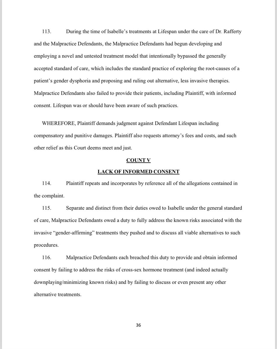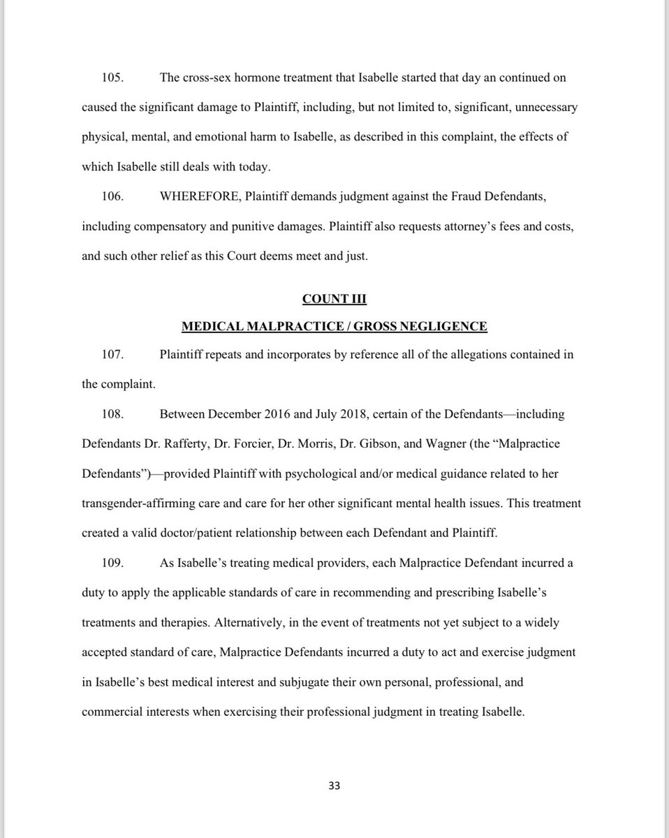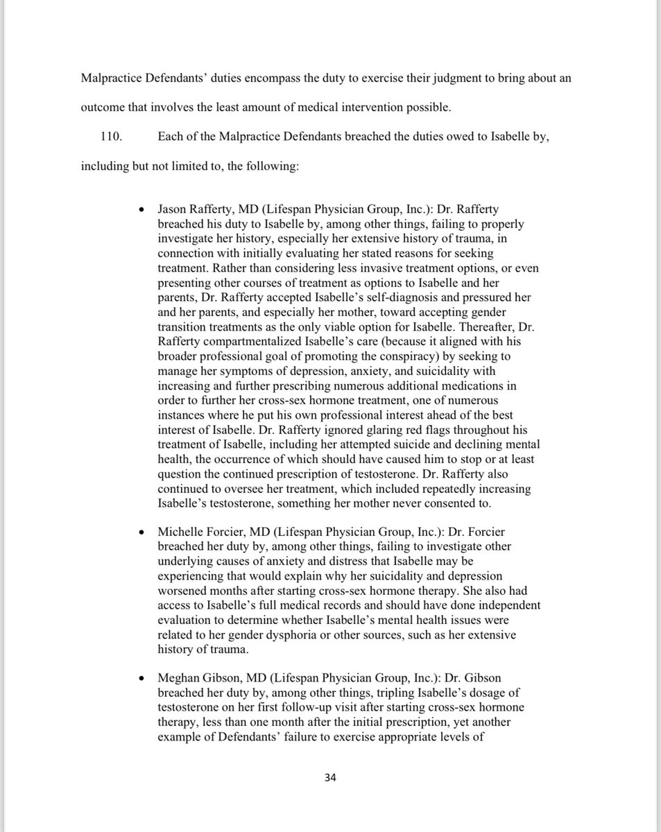 Separate and distinct from their duties owed to Isabelle under the general standard of care, Malpractice Defendants owed a duty to fully address the known risks associated with the invasive “gender-affirming” treatments they pushed and to discuss all viable alternatives to such procedures. Malpractice Defendants each breached this duty to provide and obtain informed consent by failing to address the risks of cross-sex hormone treatment (and indeed actually downplaying/minimizing known risks) and by failing to discuss or even present any other alternative treatments. Because the Malpractice Defendants failed to provide the information necessary for informed consent and failed to discuss the viable, non-invasive alternatives to the “gender- affirming” treatments, Isabelle and her parents were misled into agreeing to take testosterone, which failed to address her underlying issues, and Isabelle now suffers from irreversible changes to her body.