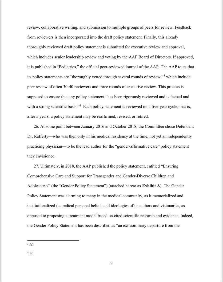 At some point between January 2016 and October 2018, the Committee chose Defendant Dr. Rafferty — who was then only in his medical residency — to be the lead author for the ‘gender-affirmative care’ policy statement they envisioned. The Gender Policy Statement was alarming to many in the medical community, as it memorialized and institutionalized the radical personal beliefs and ideologies of its authors and visionaries, as opposed to proposing a treatment model based on cited scientific research and evidence. Indeed, the Gender Policy Statement has been described as "an extraordinary departure from the international medical consensus" (which was and is watchful waiting).